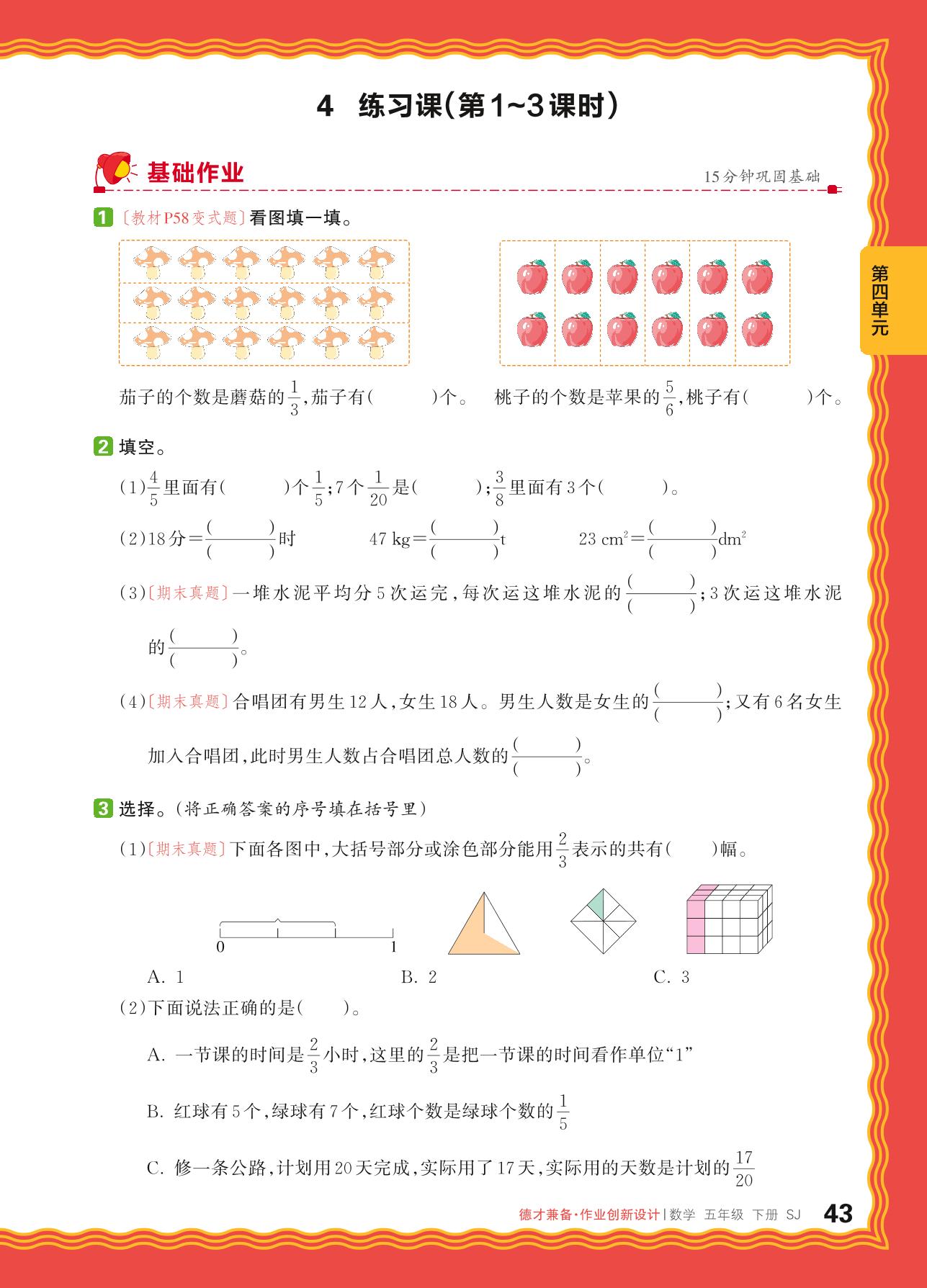 2024春下册五年级数学苏教版 第四单元 分数的意义和性质——分数的意义和分数单位、分数与除法的关系、求一个数是另一个数的几分之几练习课_R