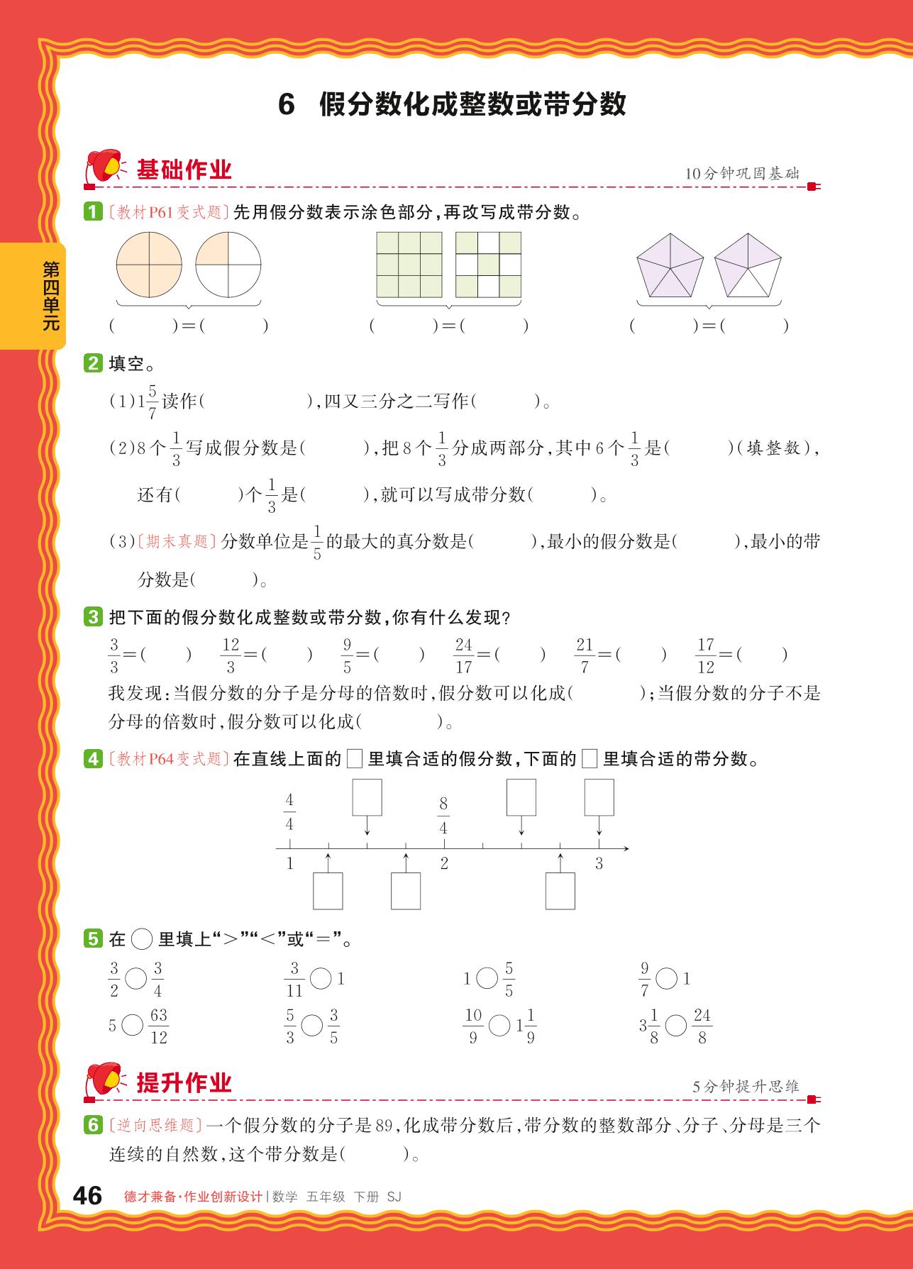 2024春下册五年级数学苏教版 第四单元 分数的意义和性质——6. 假分数化成整数或带分数