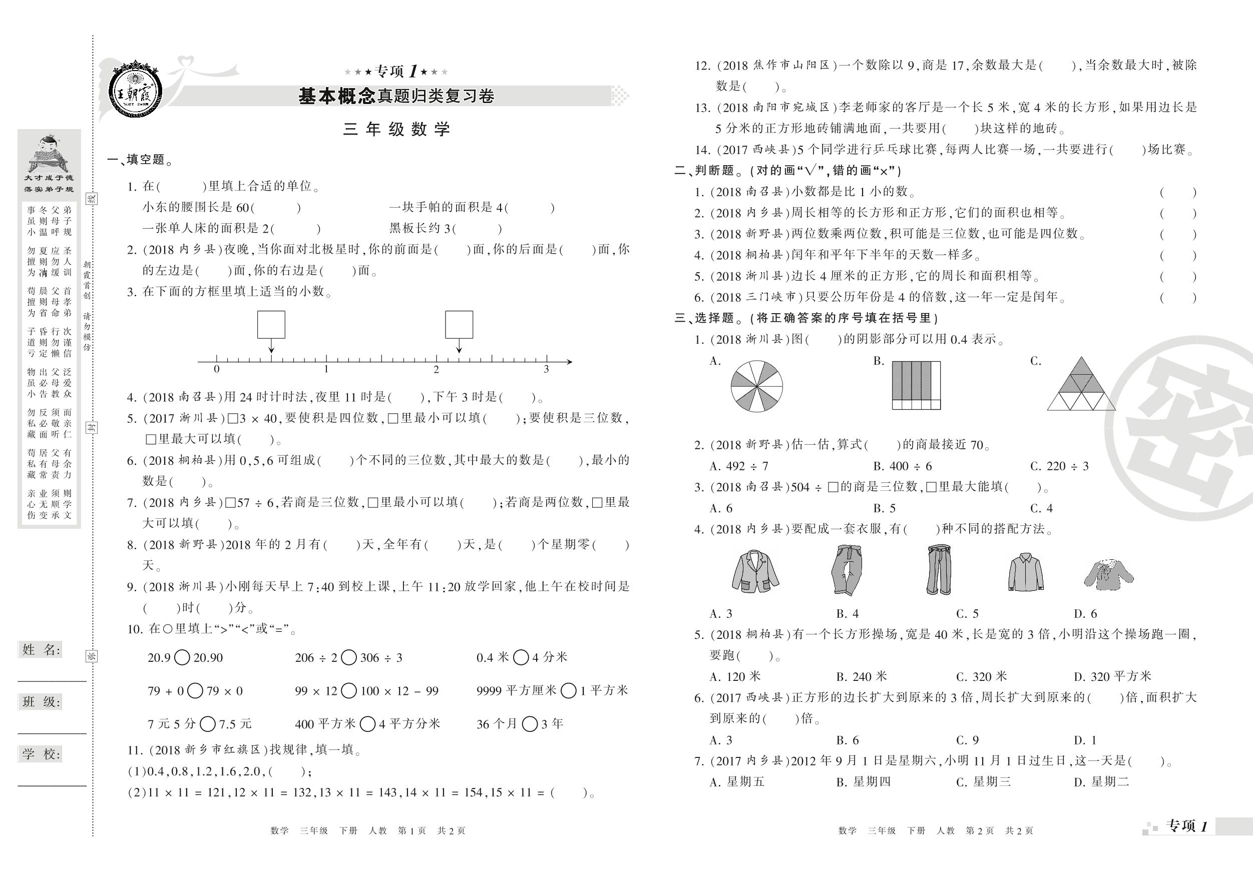 王朝霞期末专项卷——基本概念、计算真题归类复习卷三年级下册数学(人教版)_R210804100458【0】