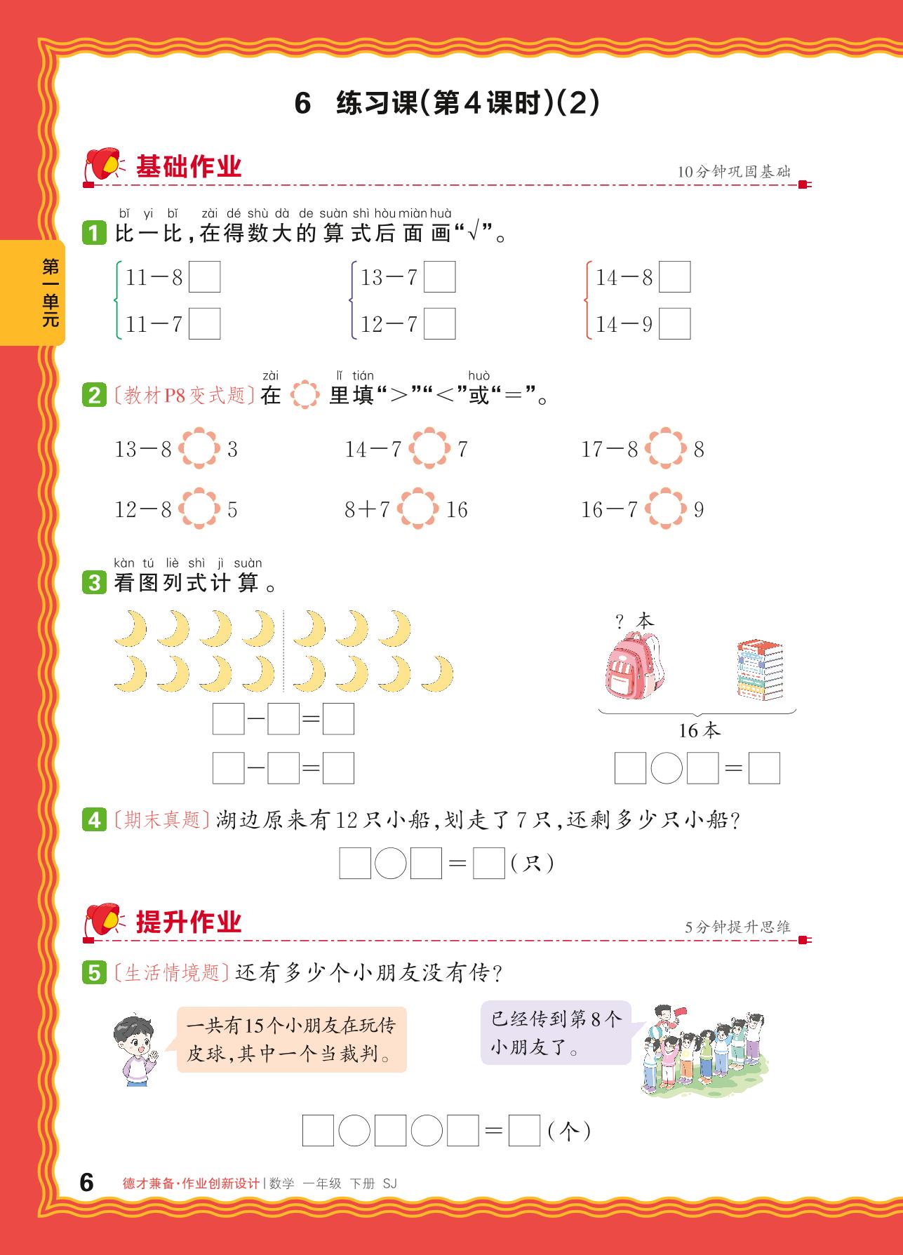 2024春下册一年级数学苏教版 第一单元 20以内的退位减法——十几减8、7练习课(2)