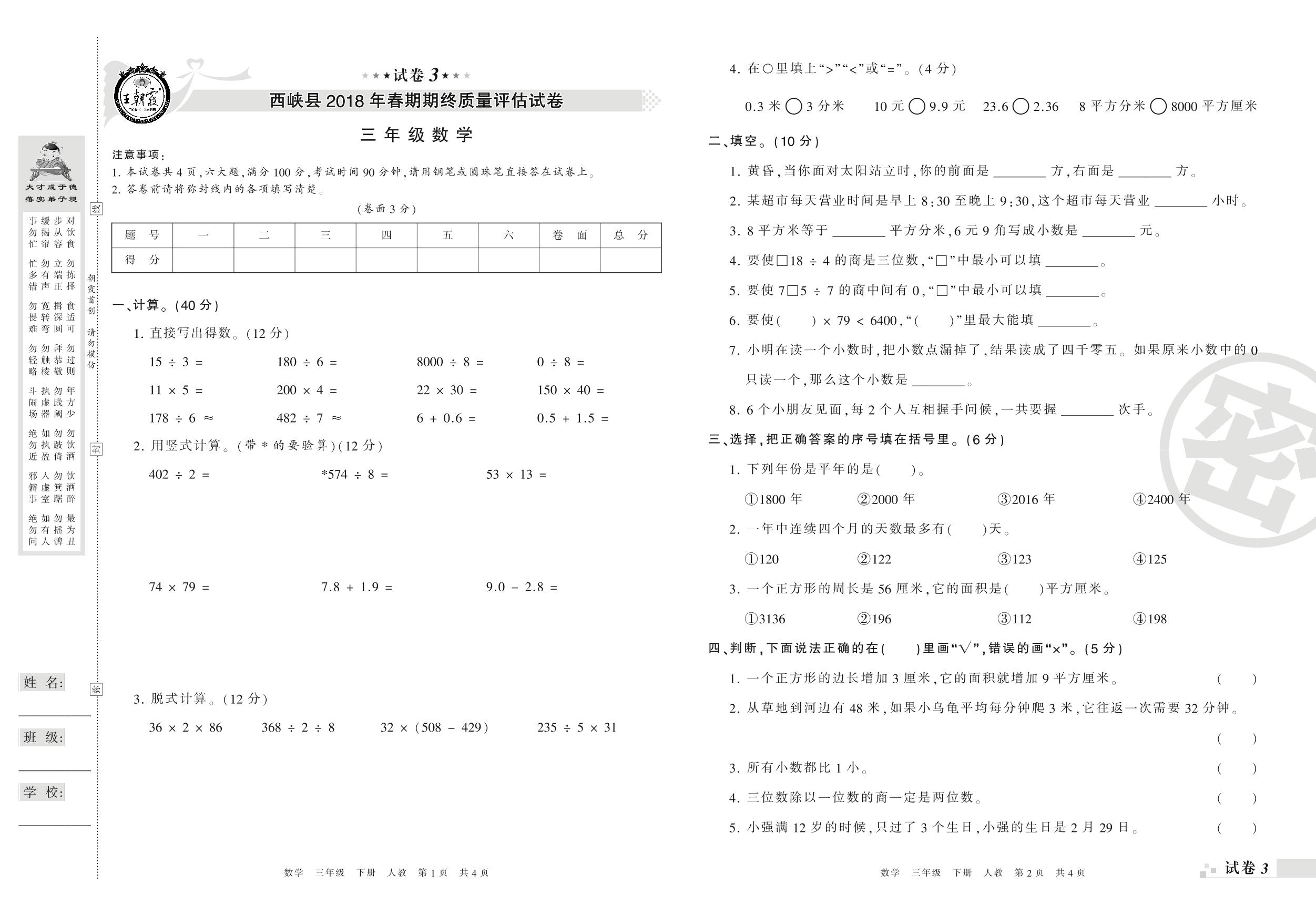 2017-2018学年第二学期南阳市西峡县三年级数学试卷(人教版)【3】