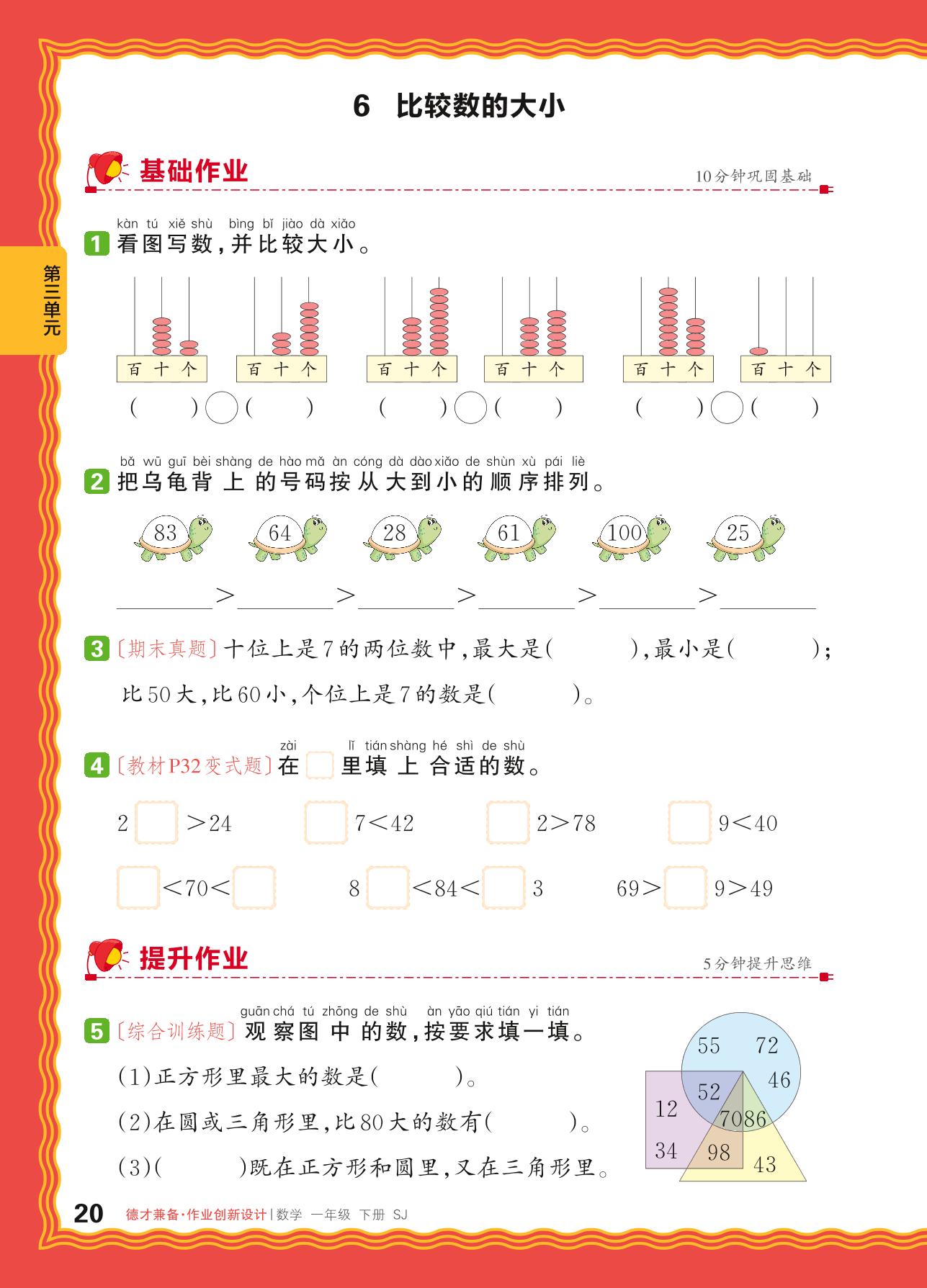 2024春下册一年级数学苏教版 第三单元 认识100以内的数——6. 比较数的大小