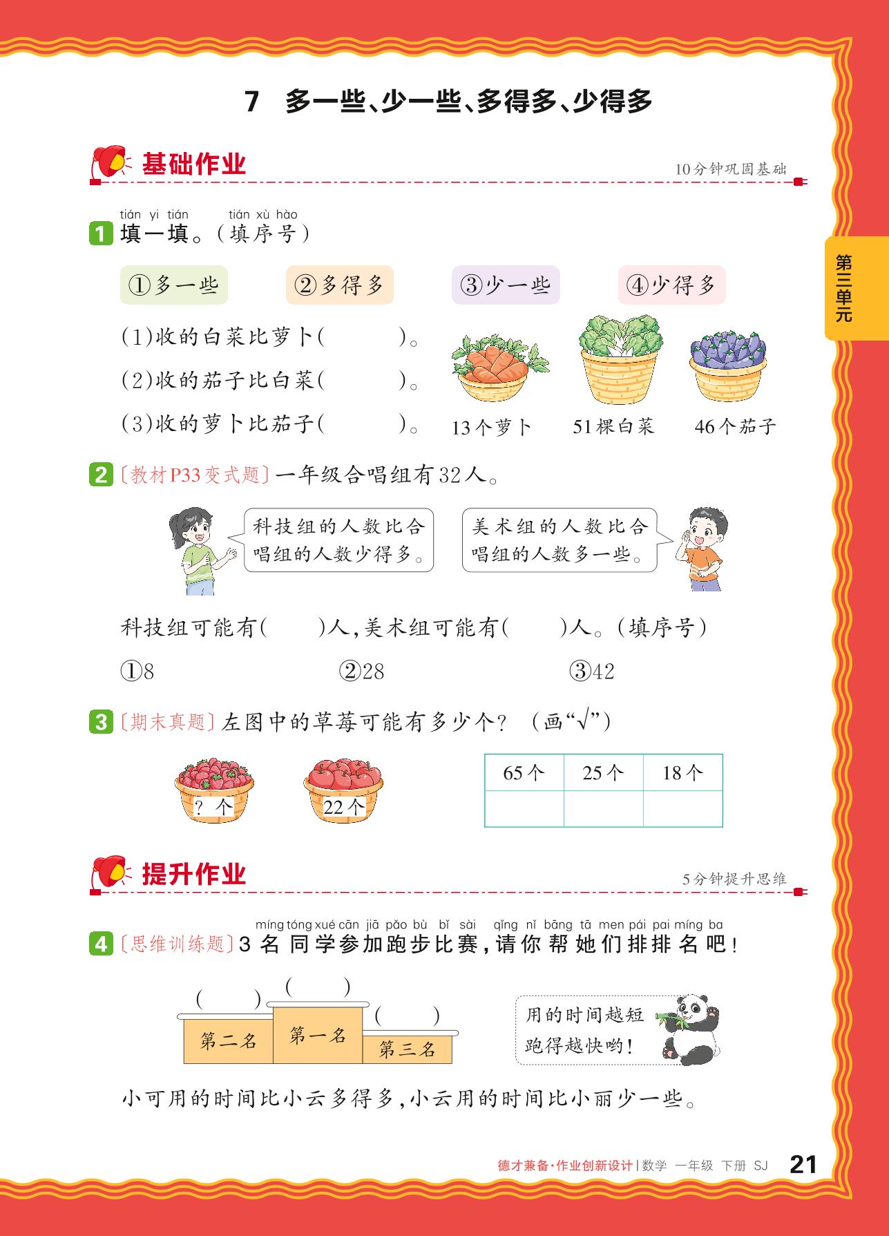 2024春下册一年级数学苏教版 第三单元 认识100以内的数——7. 多一些、少一些,多得多、少得多