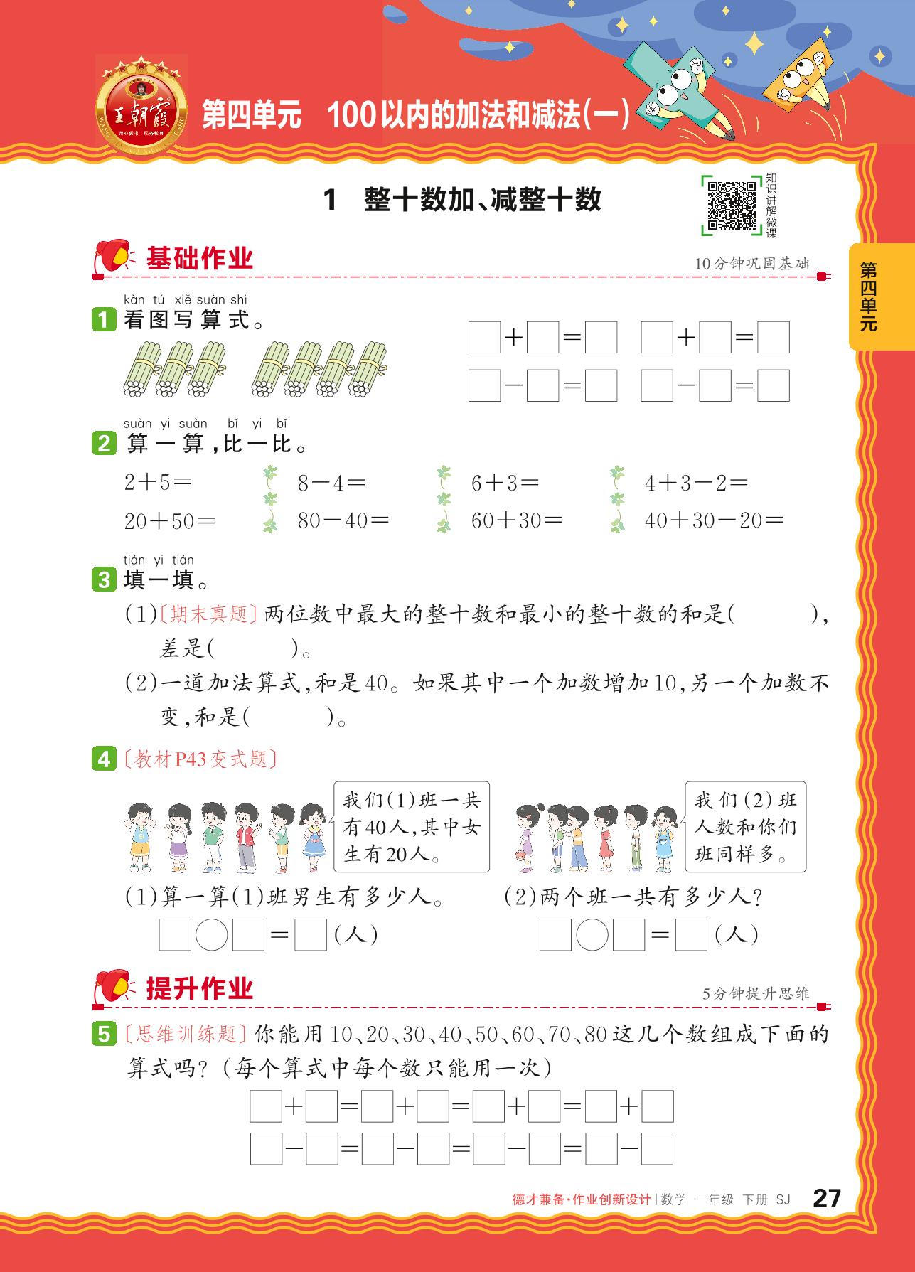 2024春下册一年级数学苏教版 第四单元 100以内的加法和减法(一)——1. 整十数加、减整十数