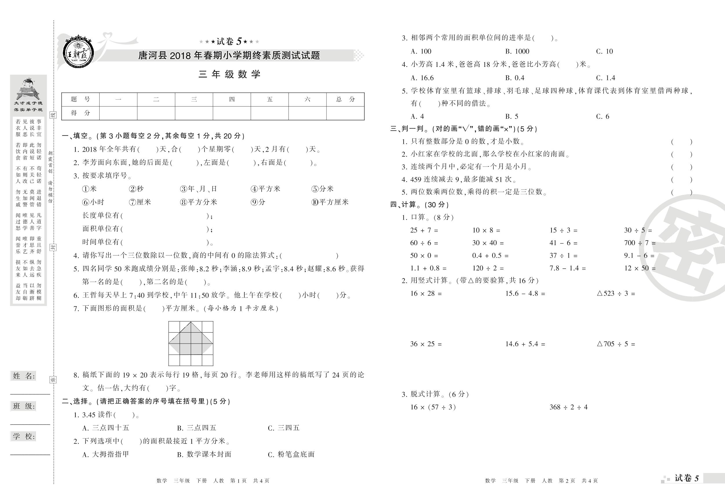 2017-2018学年第二学期南阳市唐河县三年级数学试卷(人教版)【5】