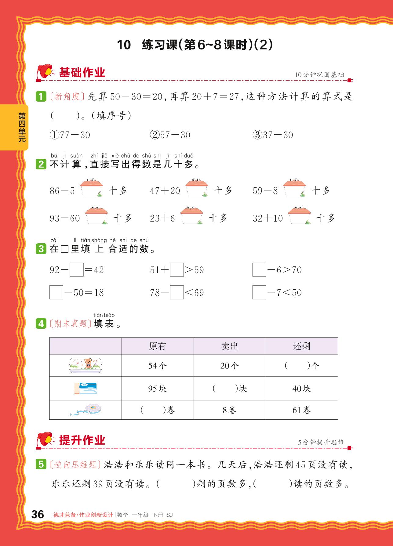 2024春下册一年级数学苏教版 第四单元 100以内的加法和减法(一)——两位数减整十数、一位数(不退位) 求减数的简单实际问题练习课(2)_R2024D6595451266892648ZMH