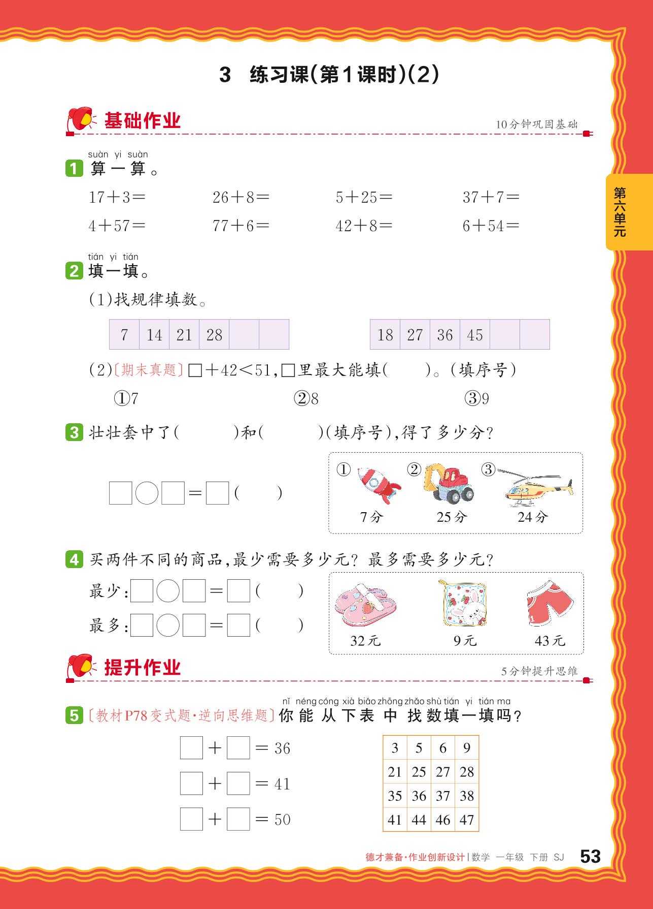 2024春下册一年级数学苏教版 第六单元 100以内的加法和减法(二)——两位数加一位数(进位)练习课(2)