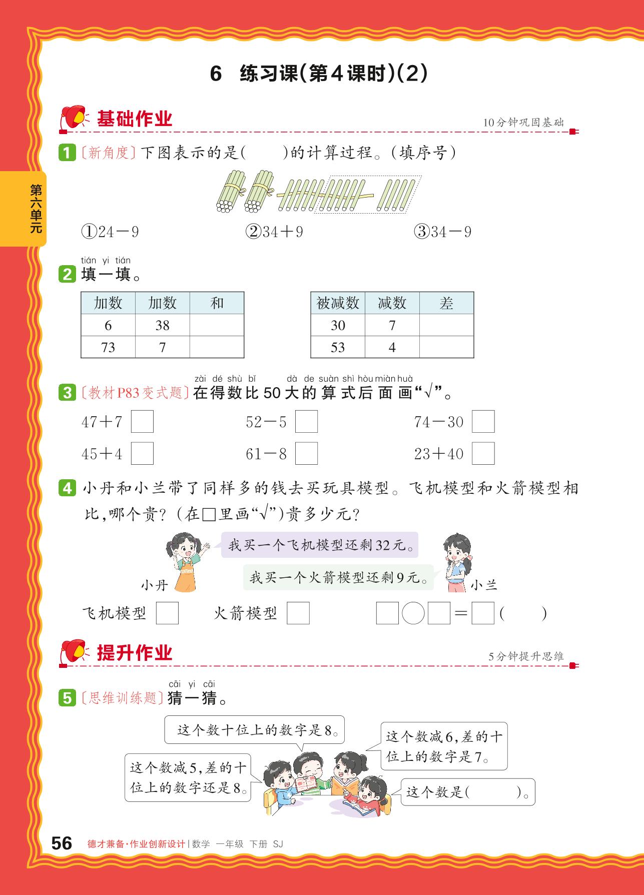 2024春下册一年级数学苏教版 第六单元 100以内的加法和减法(二)——两位数减一位数(退位)练习课(2)