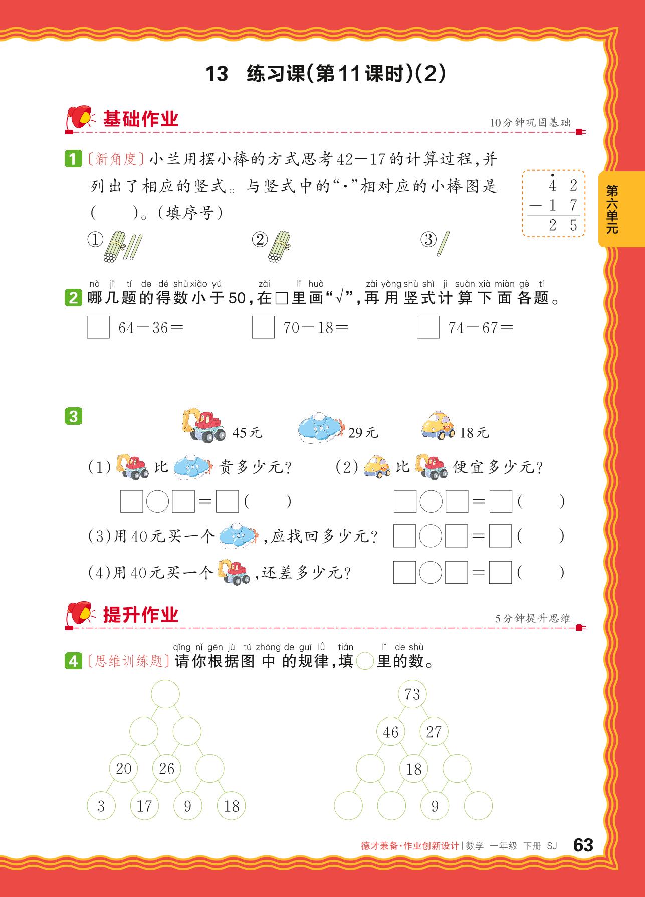 2024春下册一年级数学苏教版 第六单元 100以内的加法和减法(二)——两位数减两位数(退位)练习课(2)