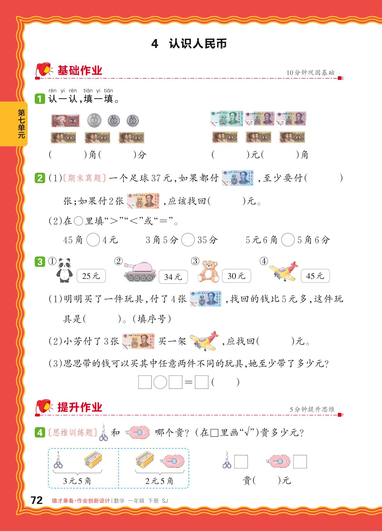 2024春下册一年级数学苏教版 第七单元 期末复习——4. 认识人民币