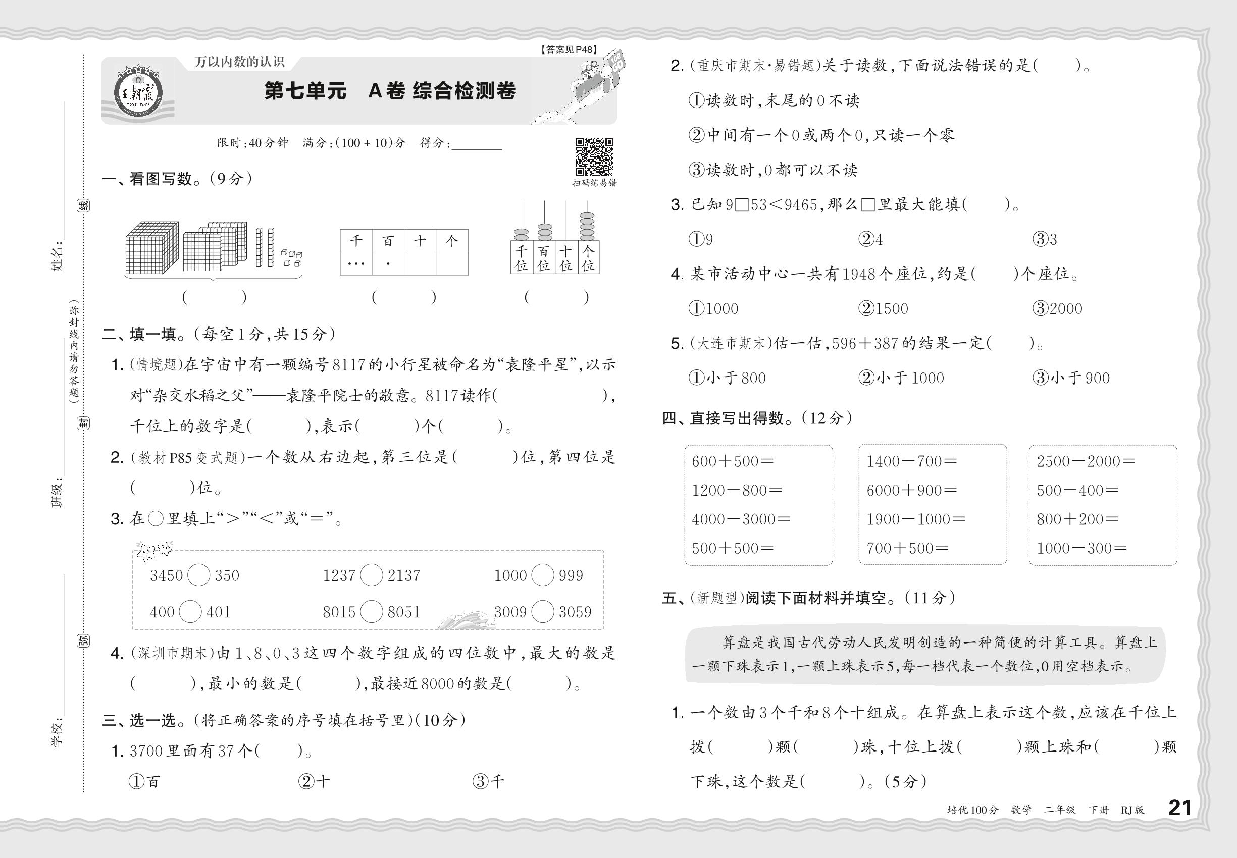 2024春下册二年级数学人教版 第七单元 A卷 综合检测卷