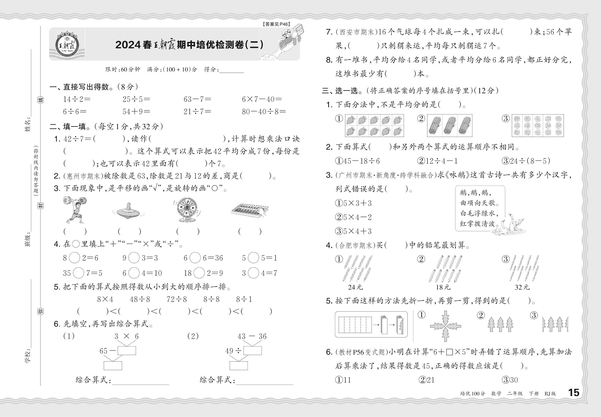 2024春下册二年级数学人教版 王朝霞期中培优检测卷(二)