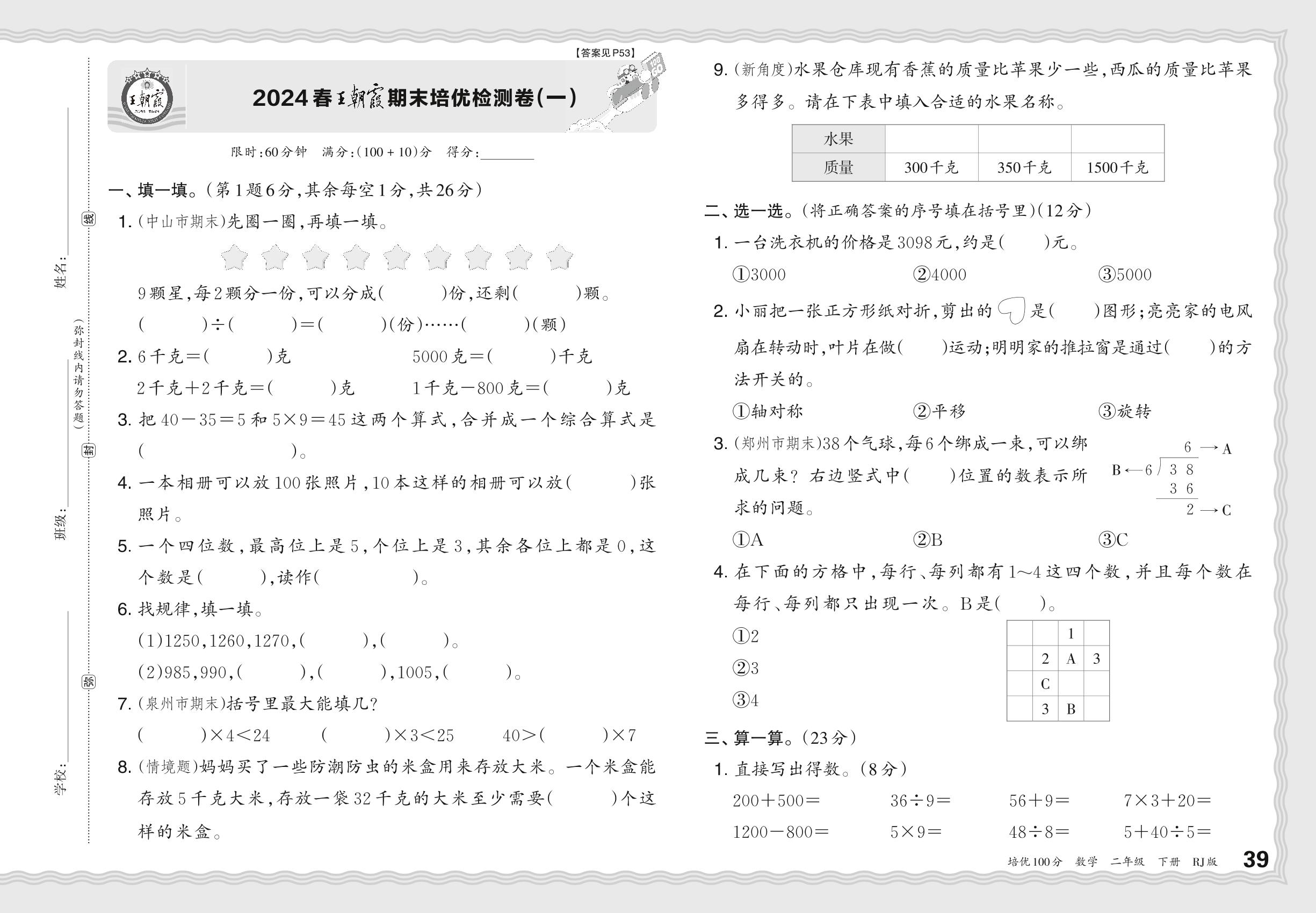 2024春下册二年级数学人教版 王朝霞期末培优检测卷(一)