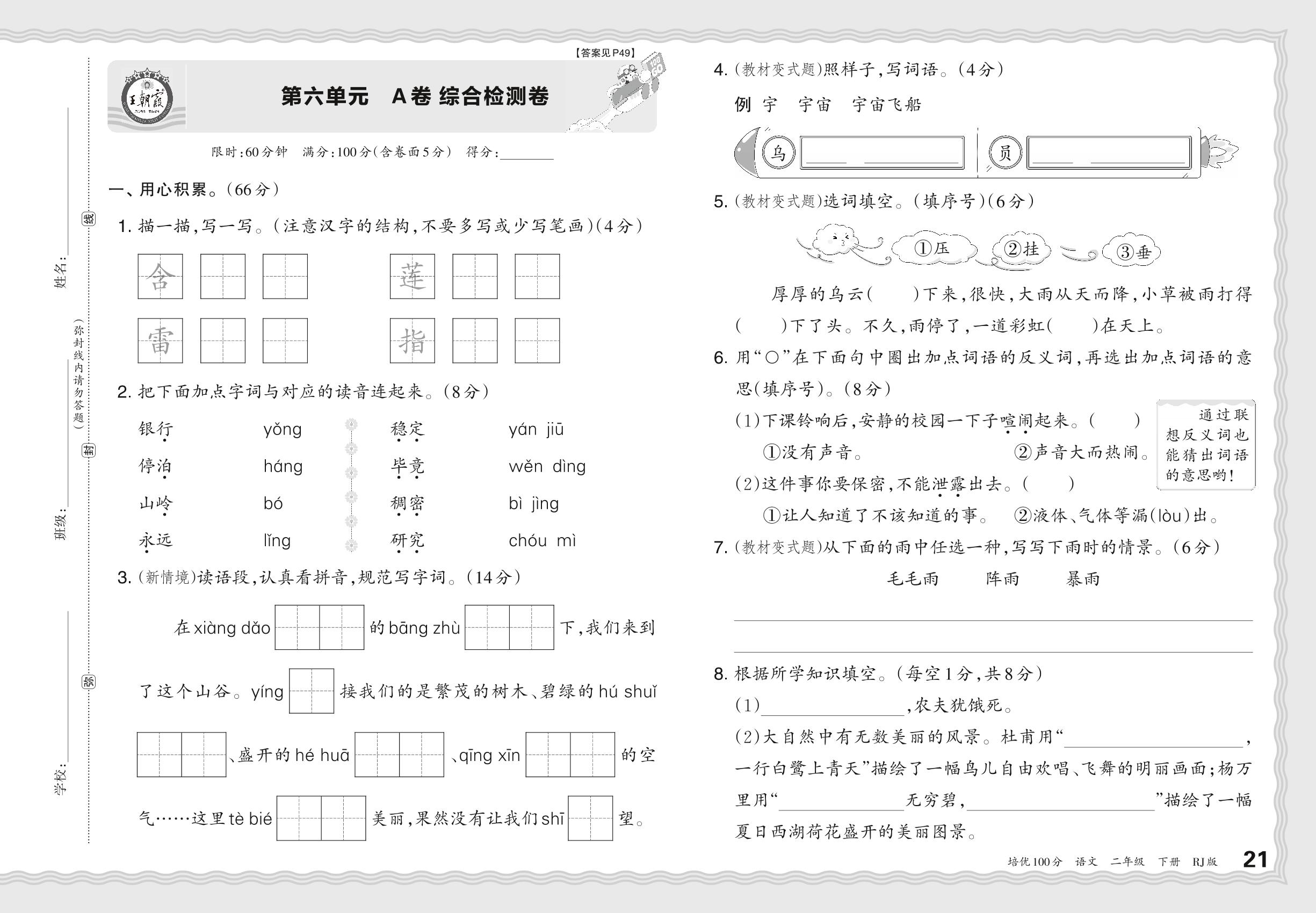 2024春下册二年级语文人教版 第六单元 A卷 综合检测卷