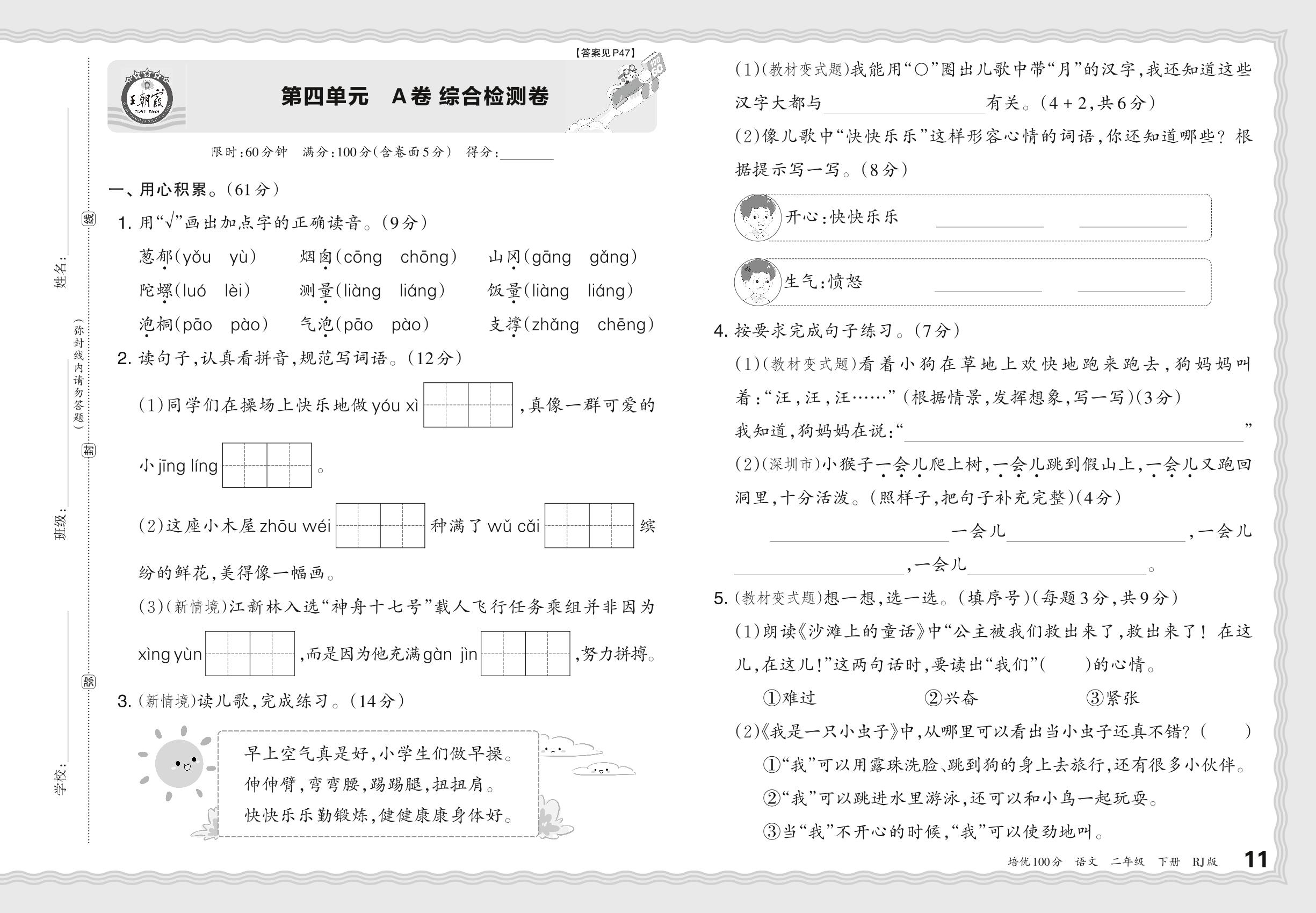 2024春下册二年级语文人教版 第四单元 A卷 综合检测卷