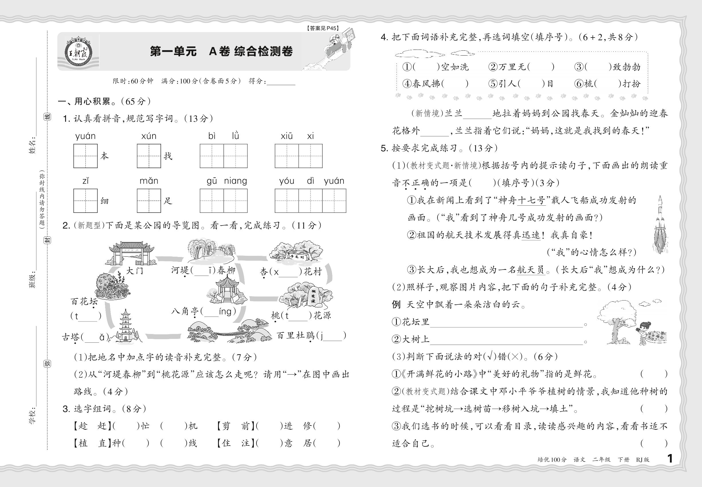 2024春下册二年级语文人教版 第一单元 A卷 综合检测卷