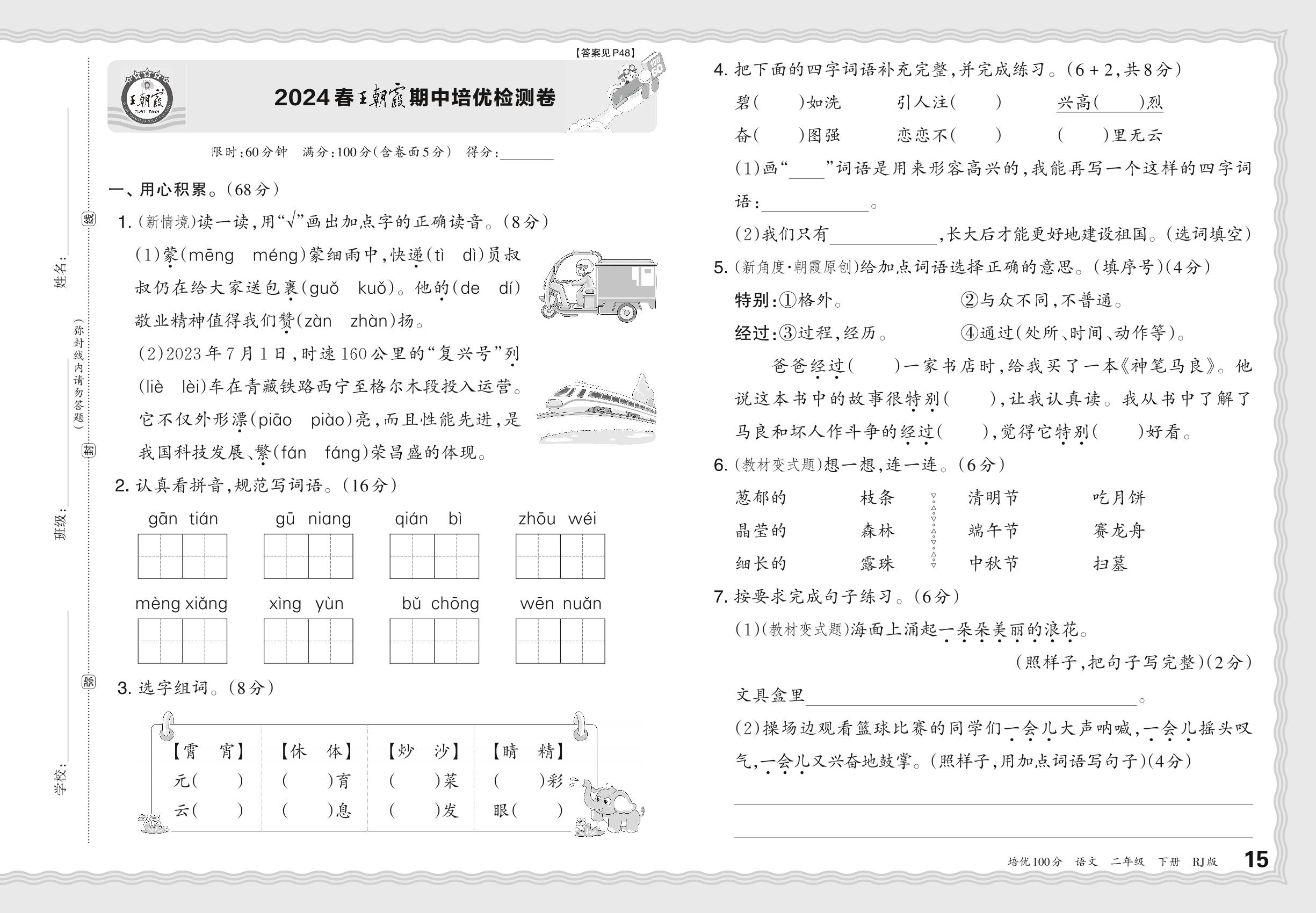 2024春下册二年级语文人教版 王朝霞期中培优检测卷