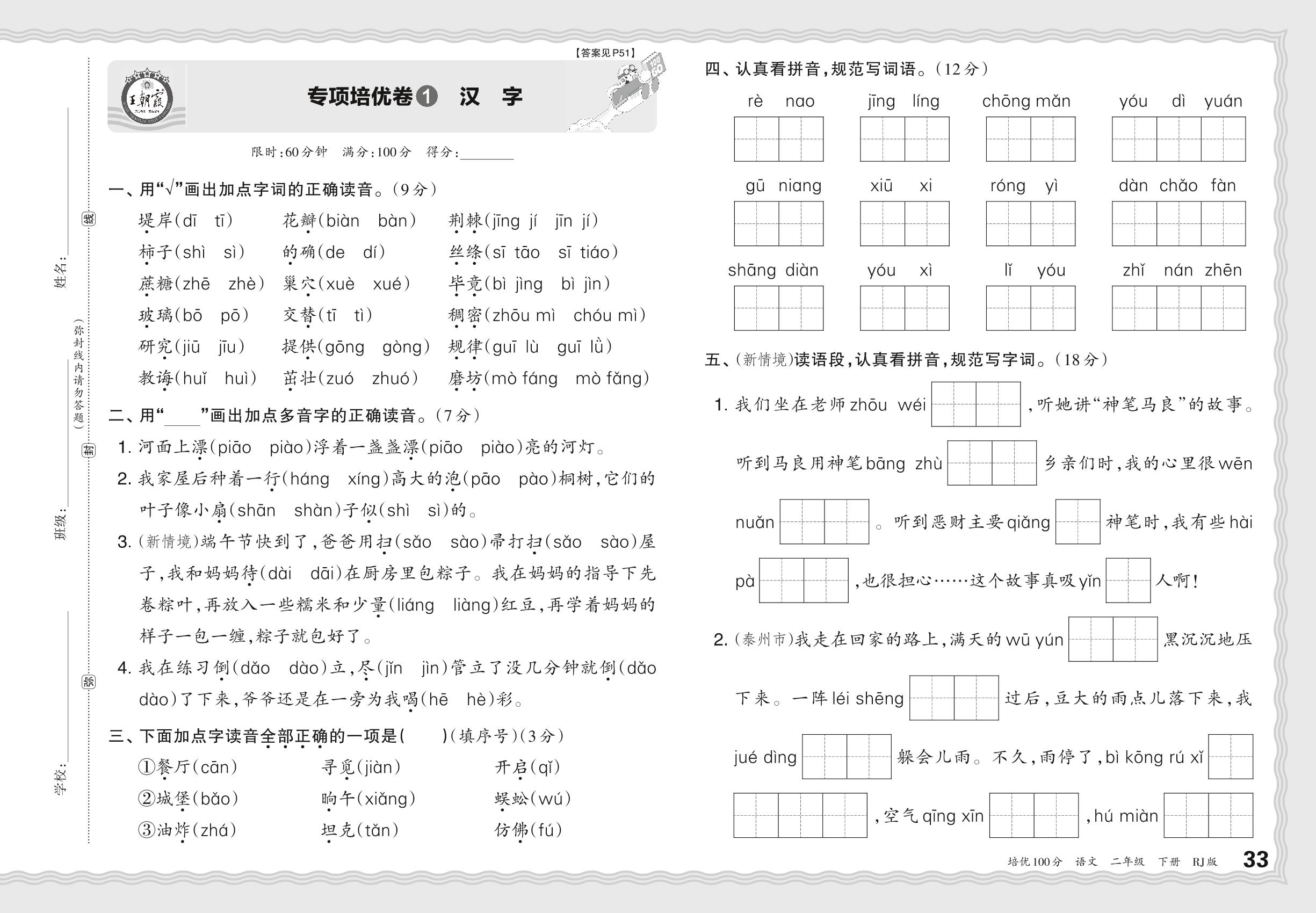 2024春下册二年级语文人教版 期末专项卷PY版·汉字【1】