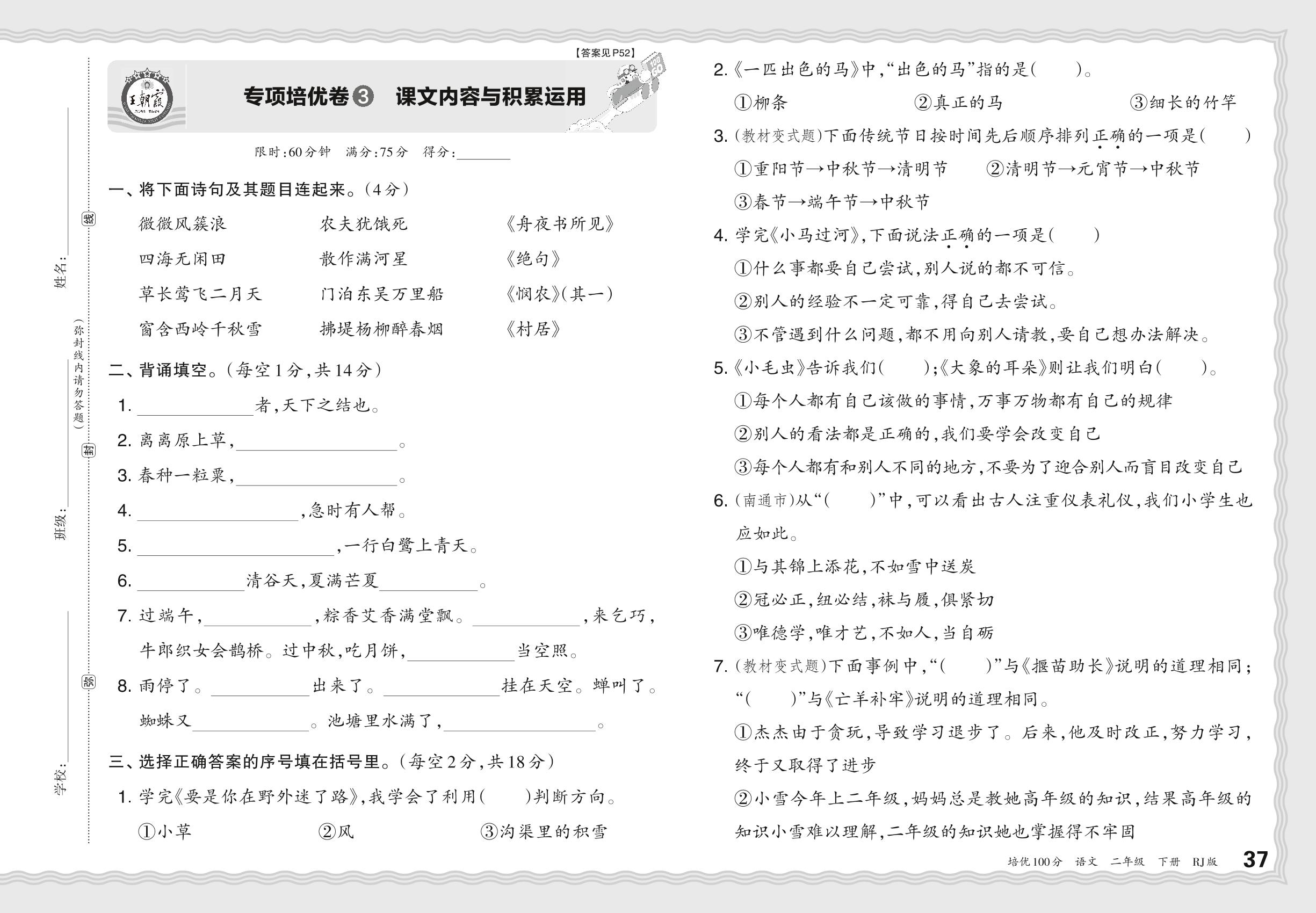 2024春下册二年级语文人教版 期末专项卷PY版·课文内容与积累运用【3】