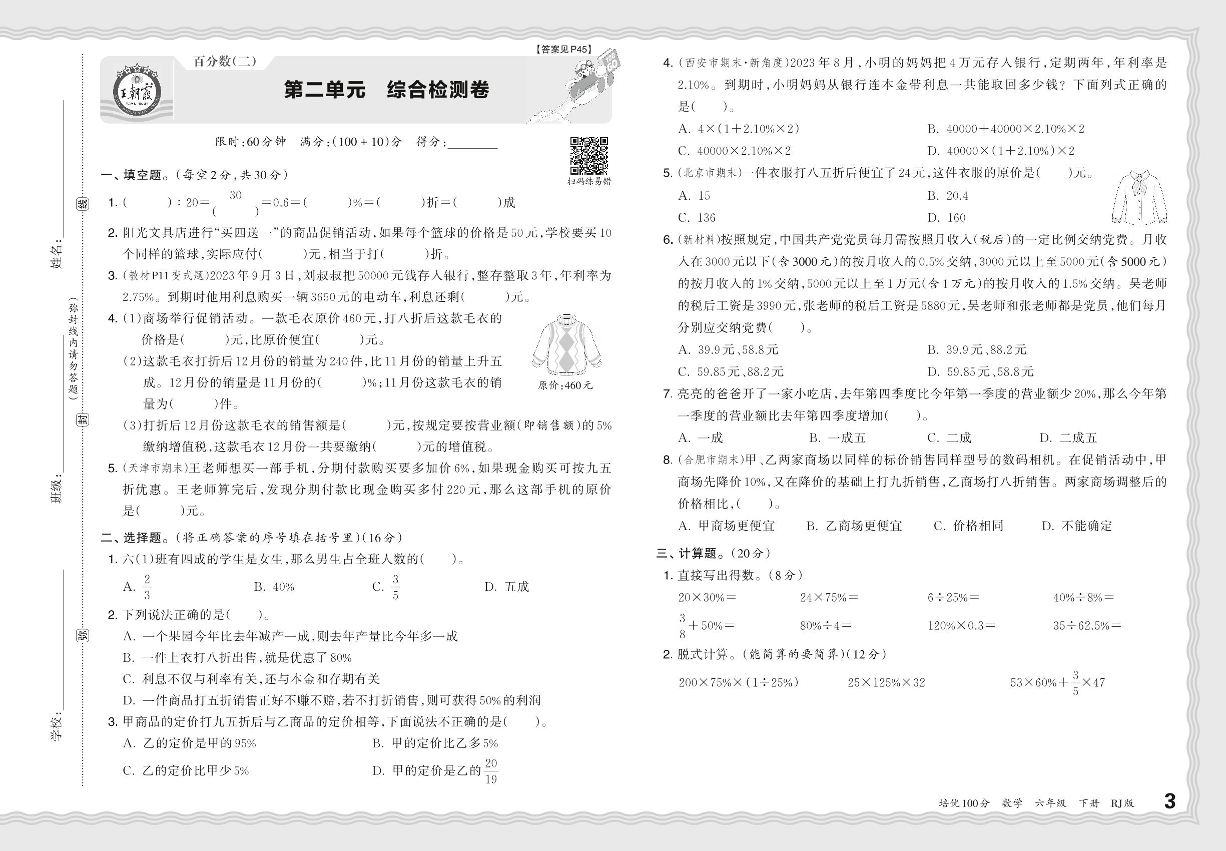 2024春下册六年级数学人教版 第二单元 综合检测卷