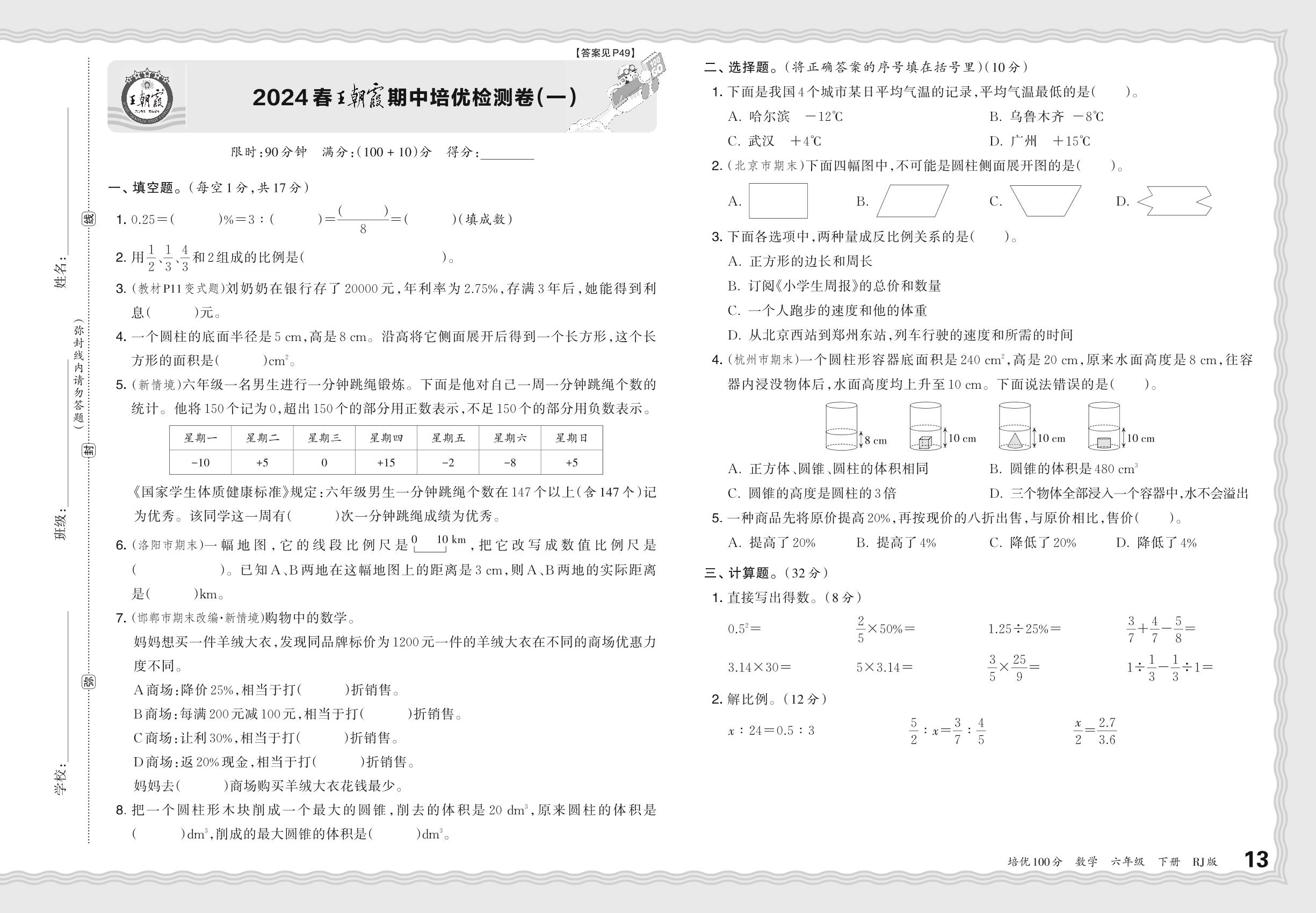 2024春下册六年级数学人教版 王朝霞期中培优检测卷(一)