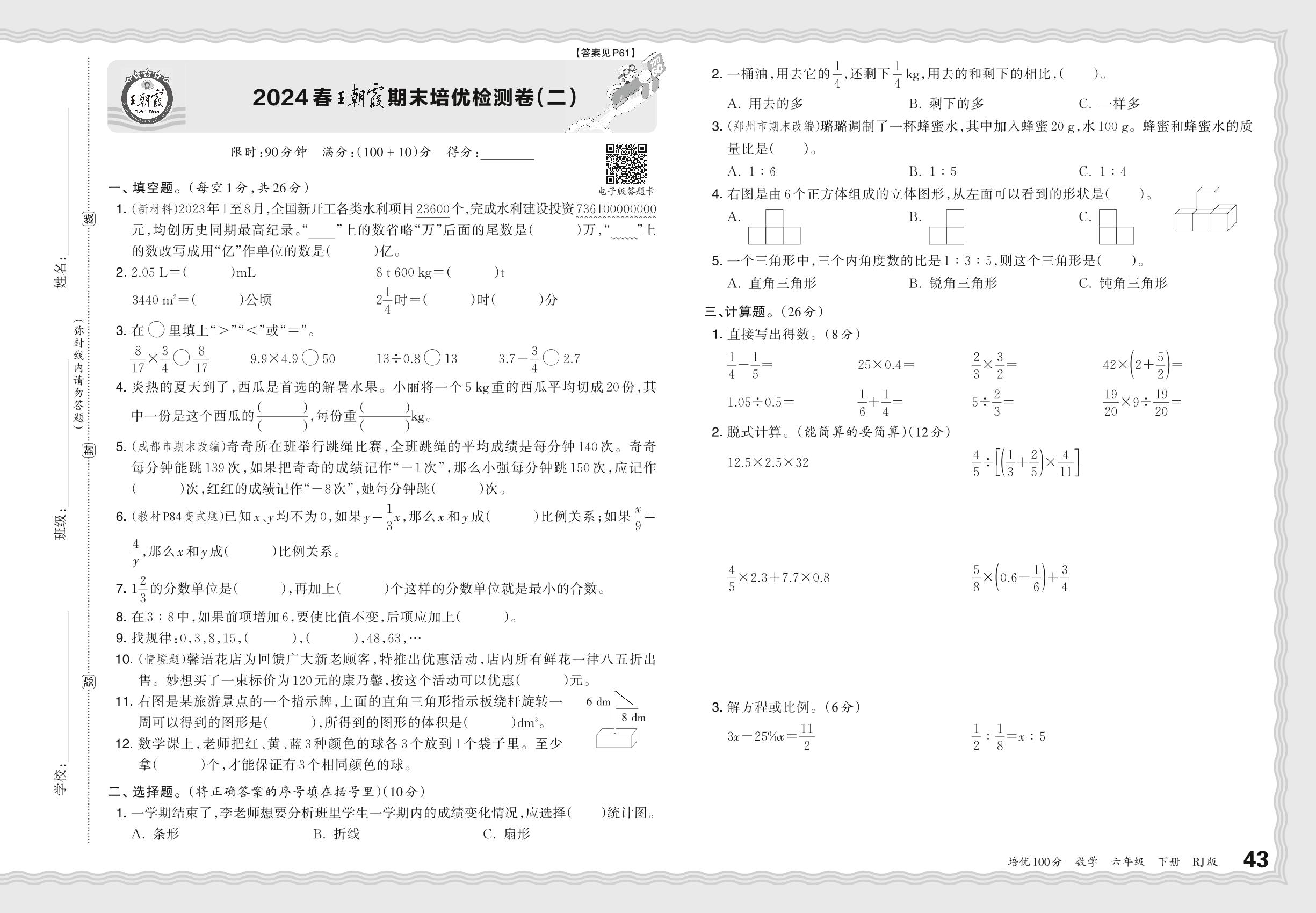 2024春下册六年级数学人教版 王朝霞期末培优检测卷(二)