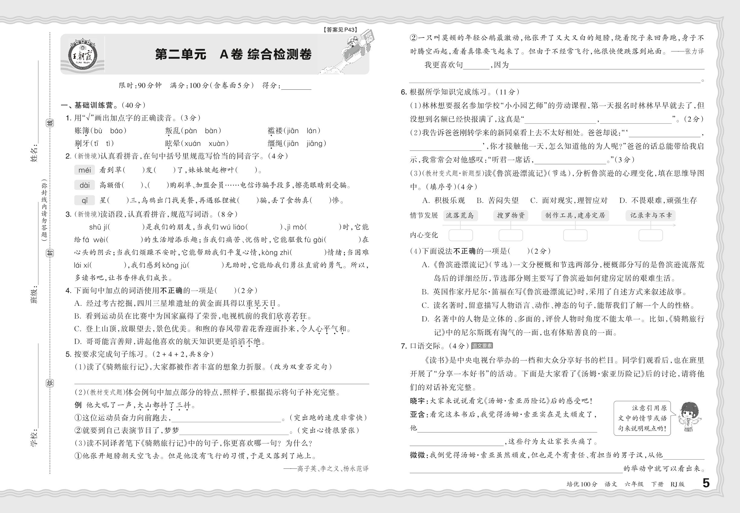 2024春下册六年级语文人教版 第二单元 A卷 综合检测卷