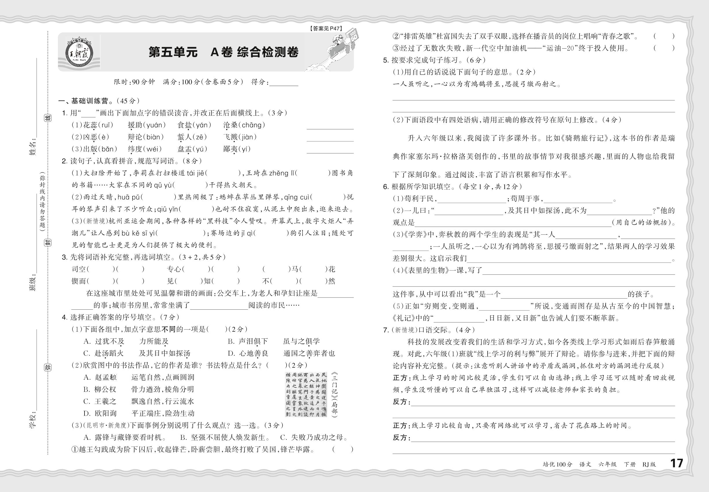 2024春下册六年级语文人教版 第五单元 A卷 综合检测卷