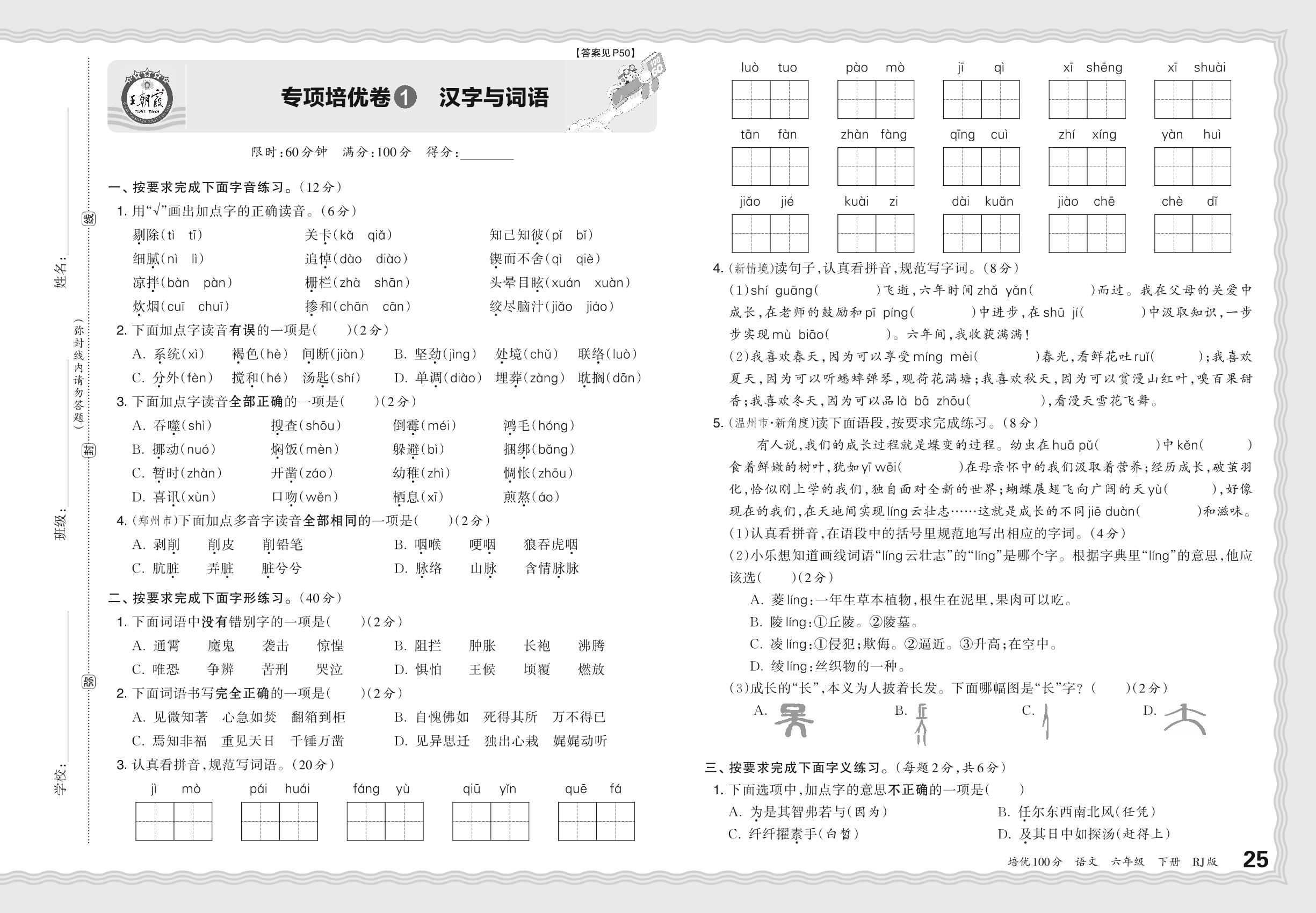 2024春下册六年级语文人教版 期末专项卷PY版·汉字与词语【1】