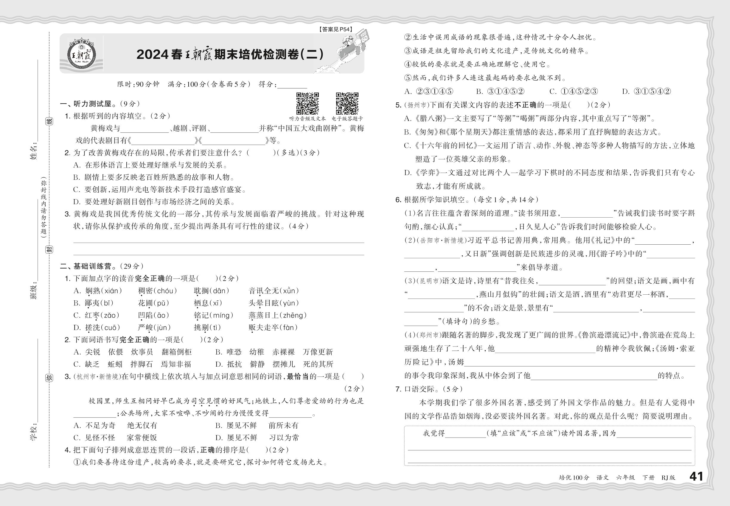 2024春下册六年级语文人教版 王朝霞期末培优检测卷(二)