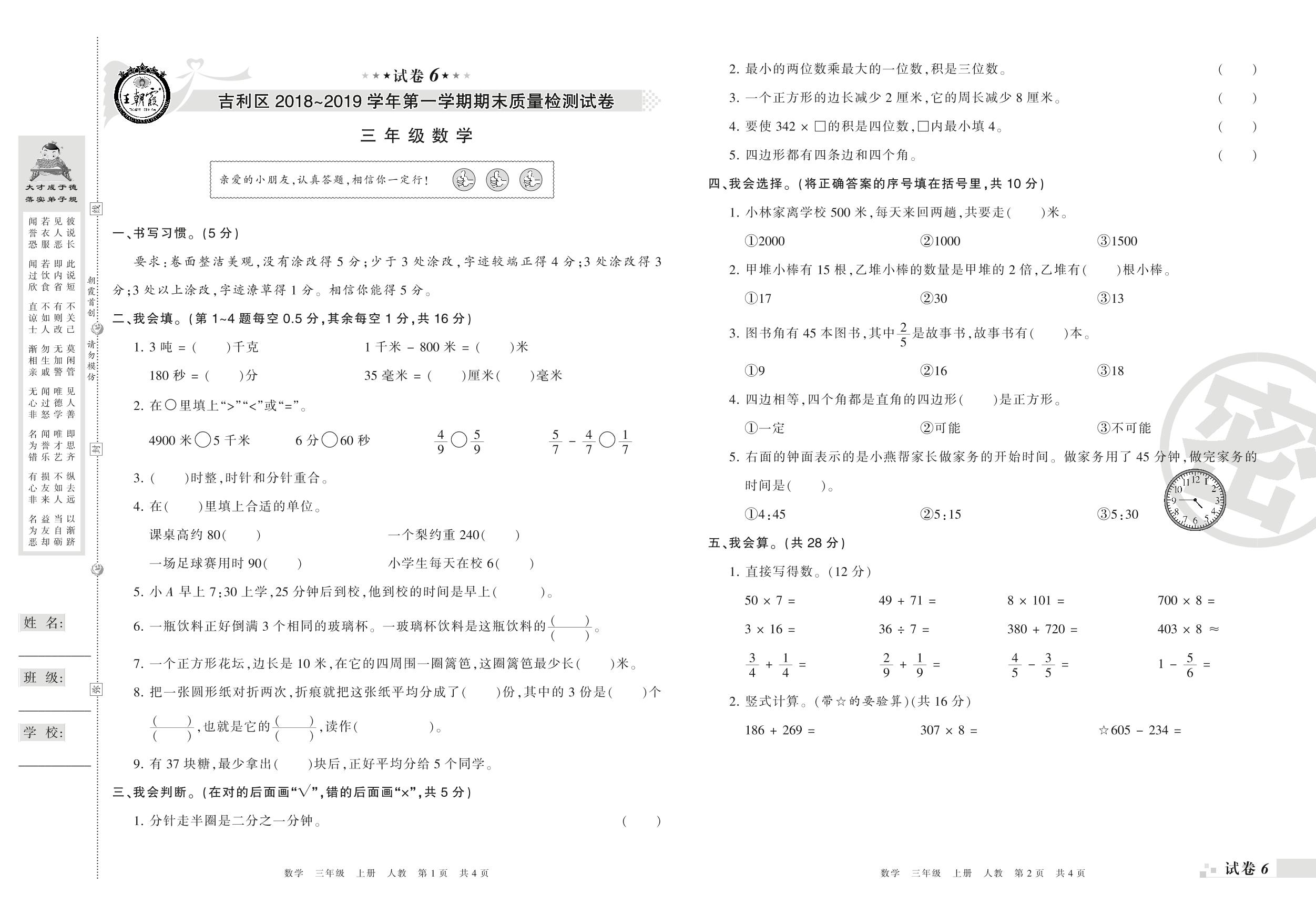 2018-2019学年第一学期洛阳市吉利区三年级数学试卷(人教版)【6】