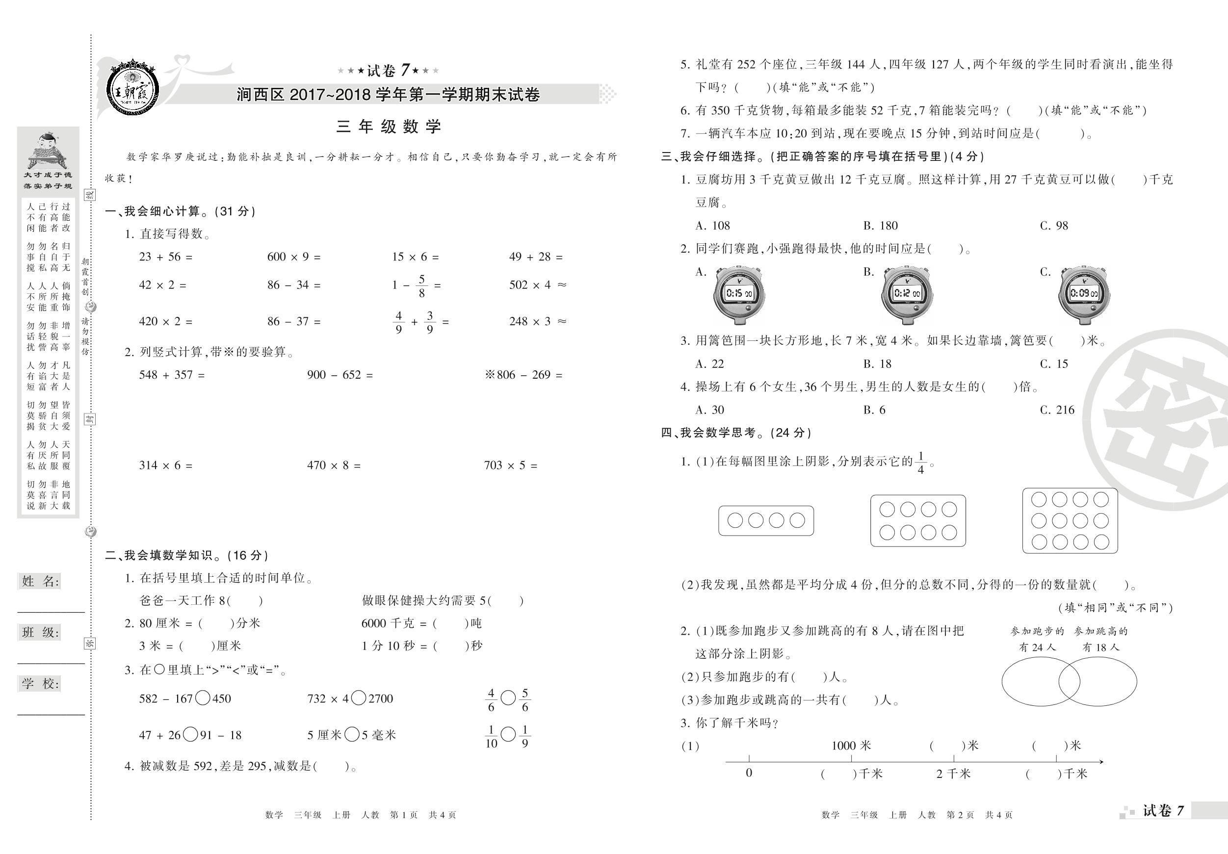 2017-2018学年第一学期洛阳市涧西区三年级数学试卷(人教版)【7】