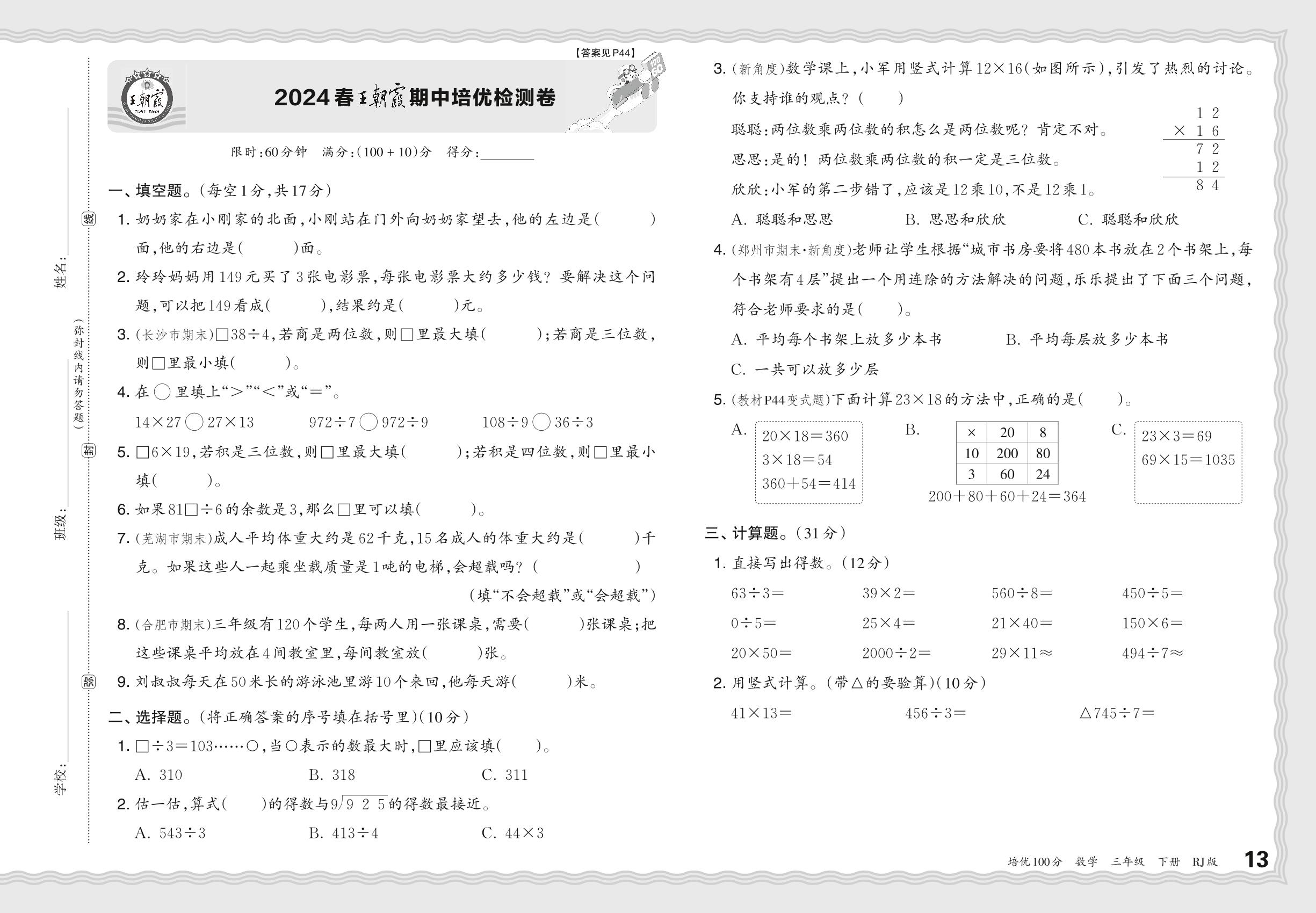2024春下册三年级数学人教版 王朝霞期中培优检测卷