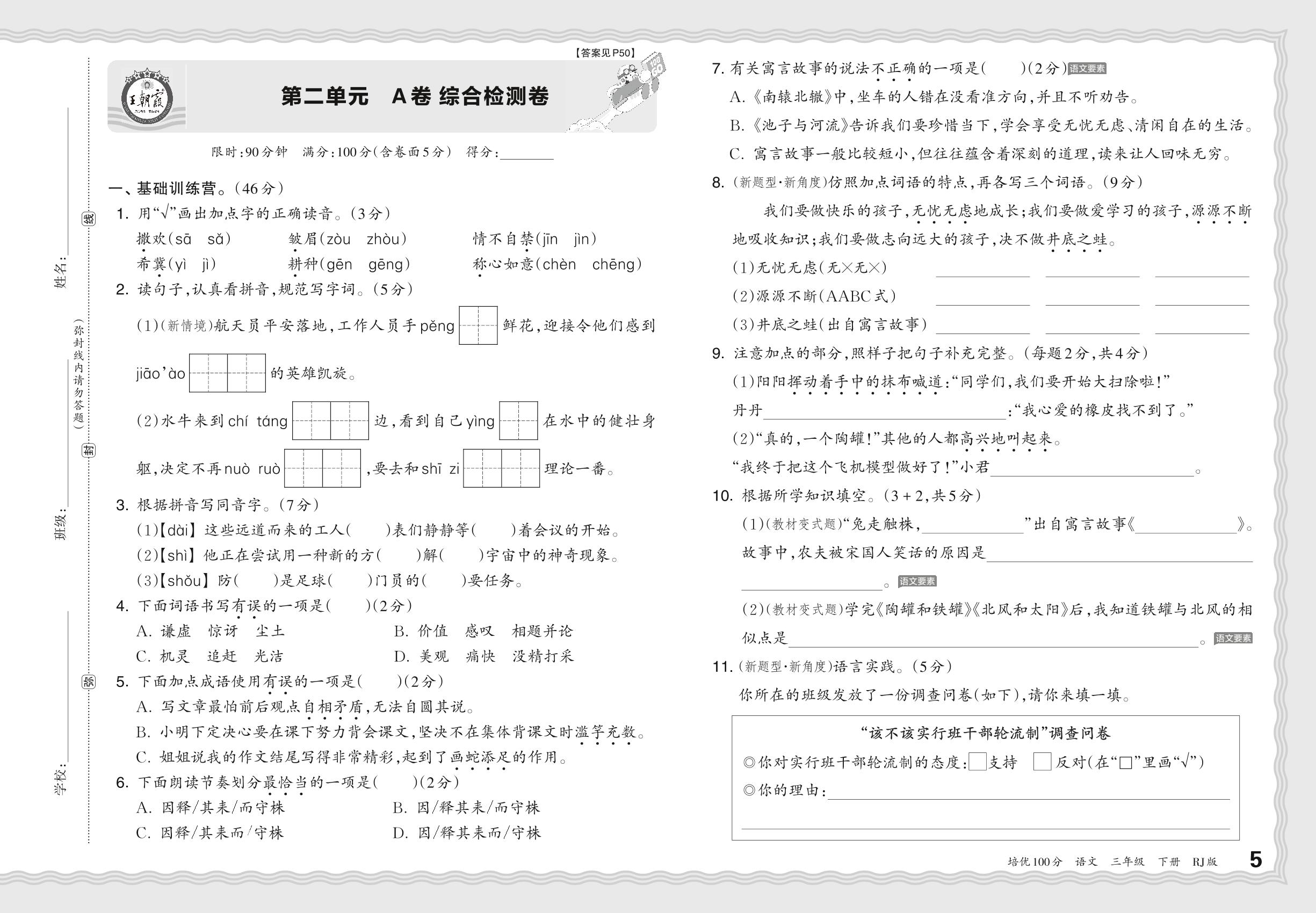 2024春下册三年级语文人教版 第二单元 A卷 综合检测卷