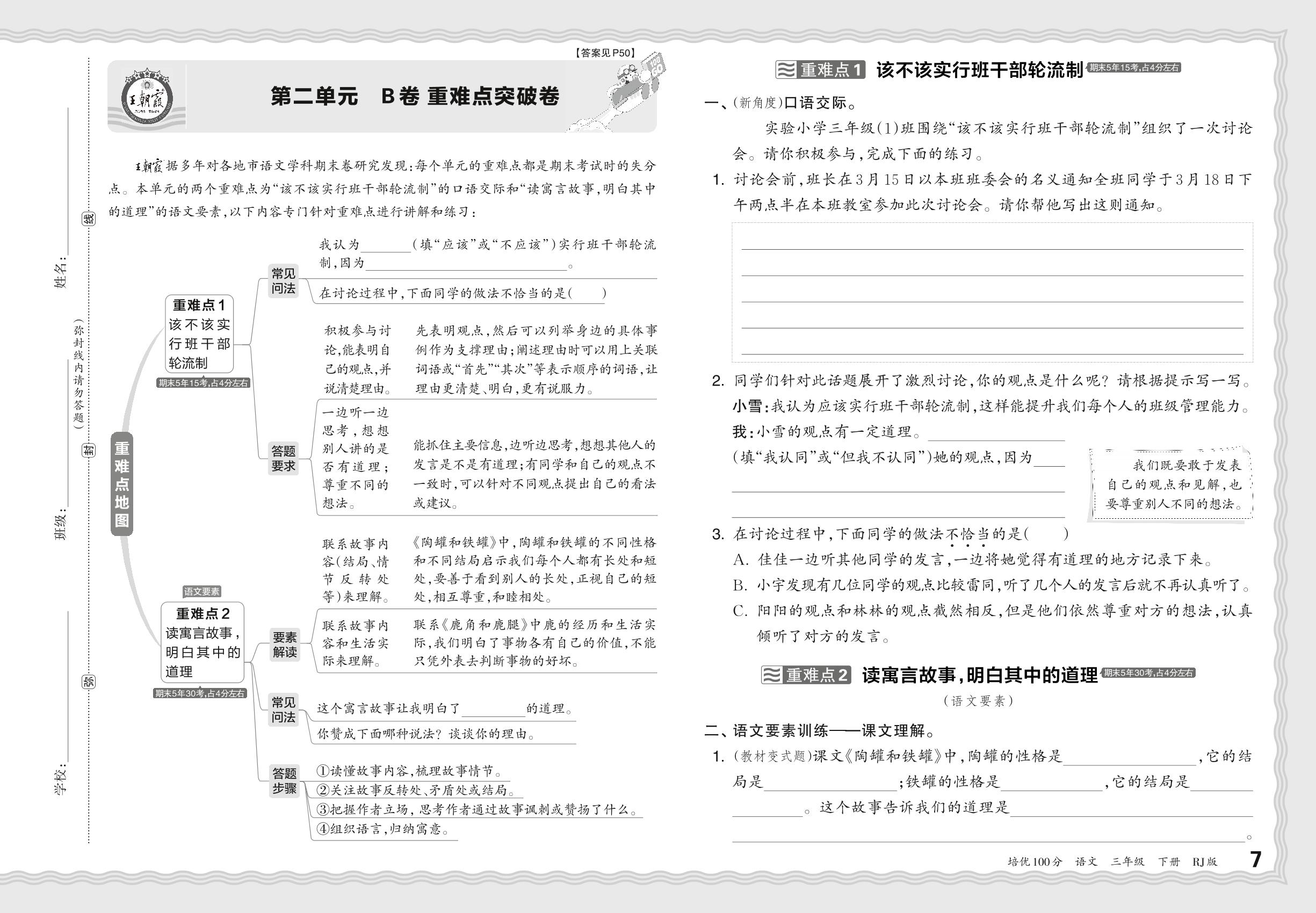 2024春下册三年级语文人教版 第二单元 B卷 重难点突破卷
