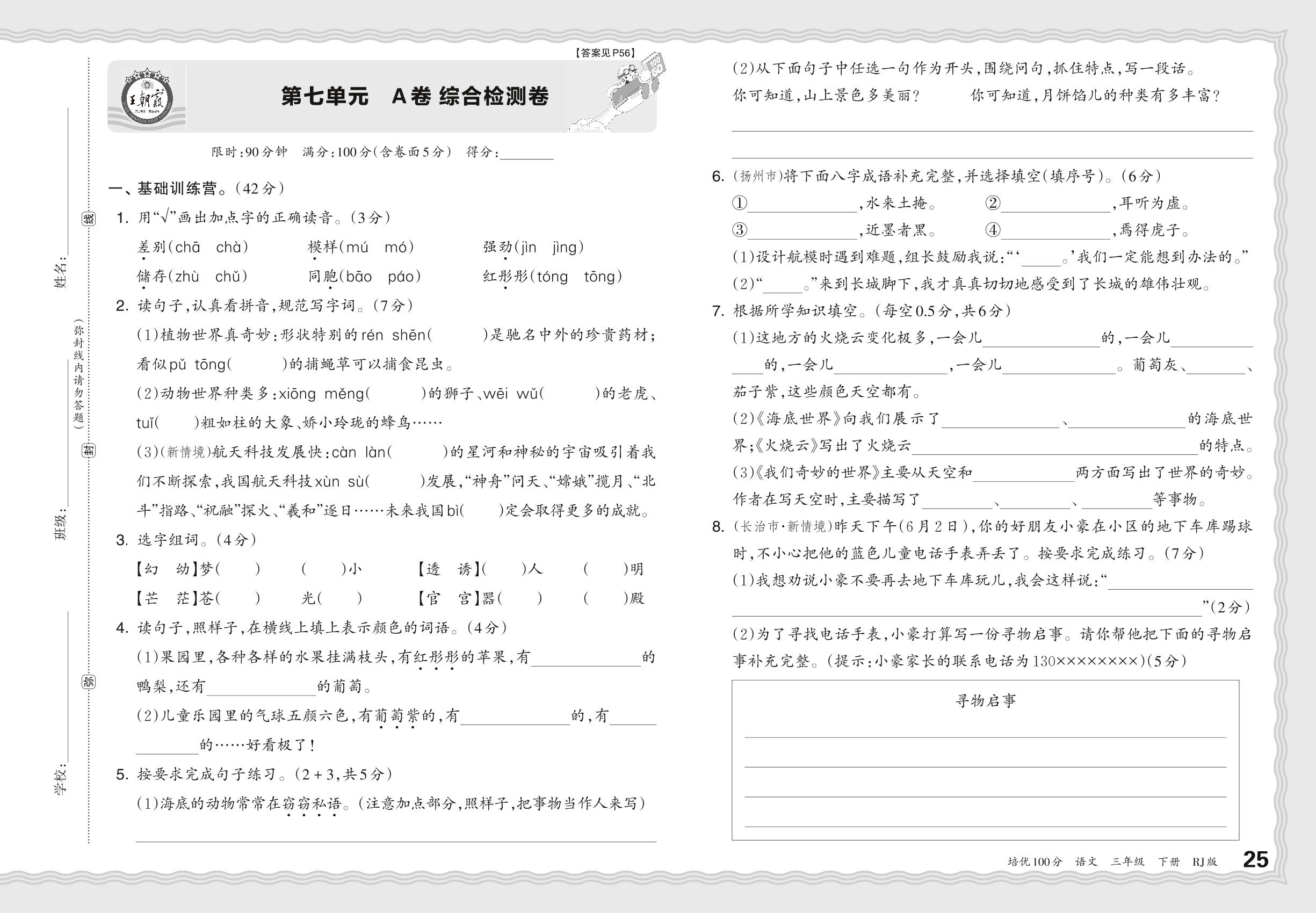 2024春下册三年级语文人教版 第七单元 A卷 综合检测卷