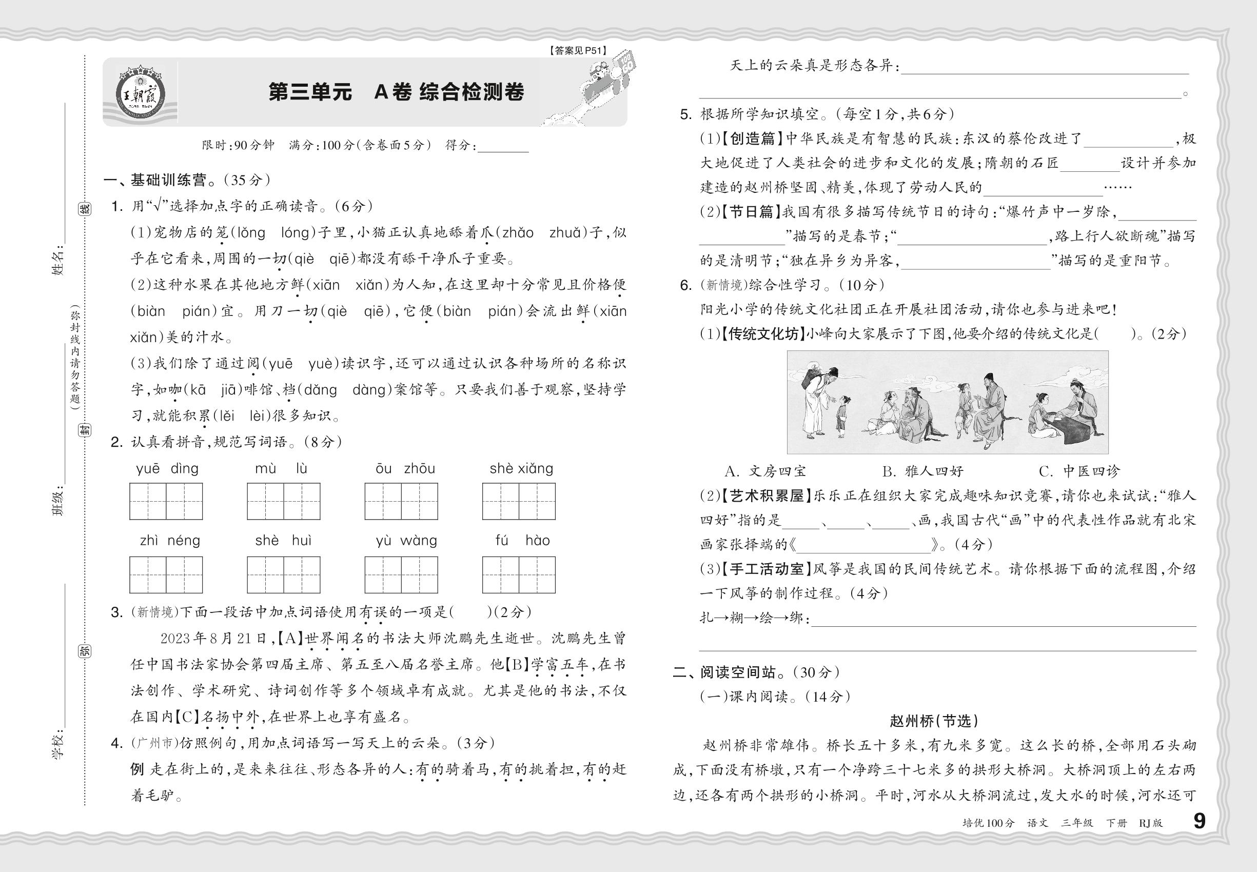 2024春下册三年级语文人教版 第三单元 A卷 综合检测卷