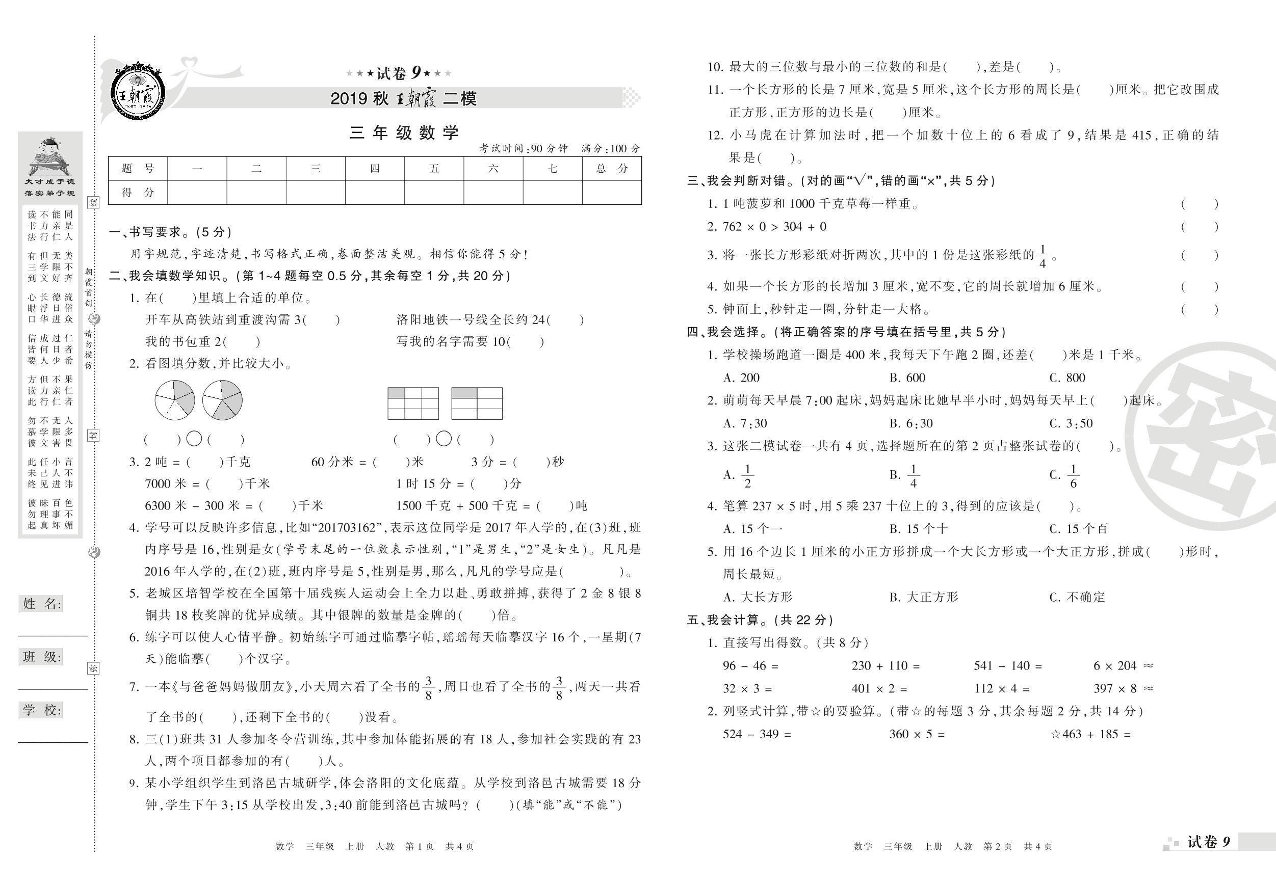 王朝霞期末模拟卷三年级上册数学(人教版)_R210804100610【9】