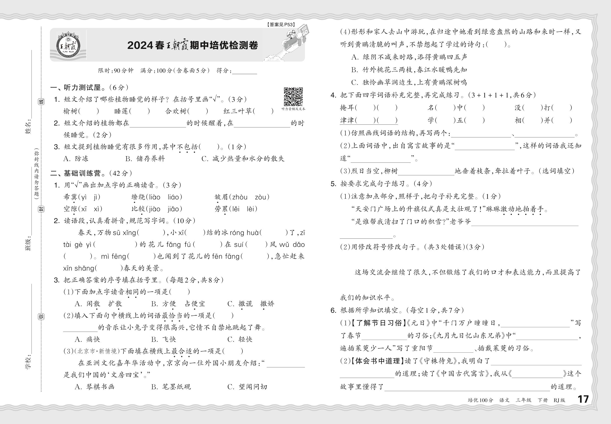 2024春下册三年级语文人教版 王朝霞期中培优检测卷