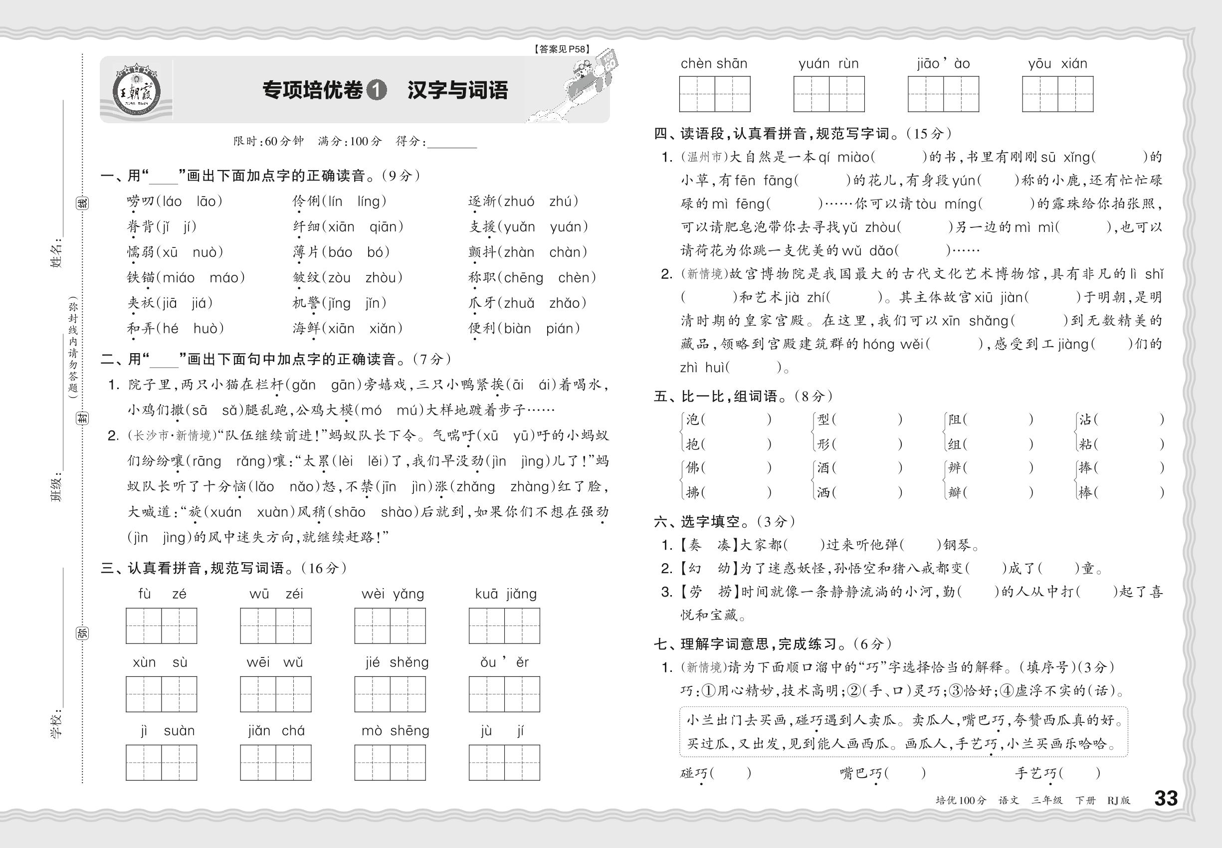 2024春下册三年级语文人教版 期末专项卷PY版·汉字与词语【1】