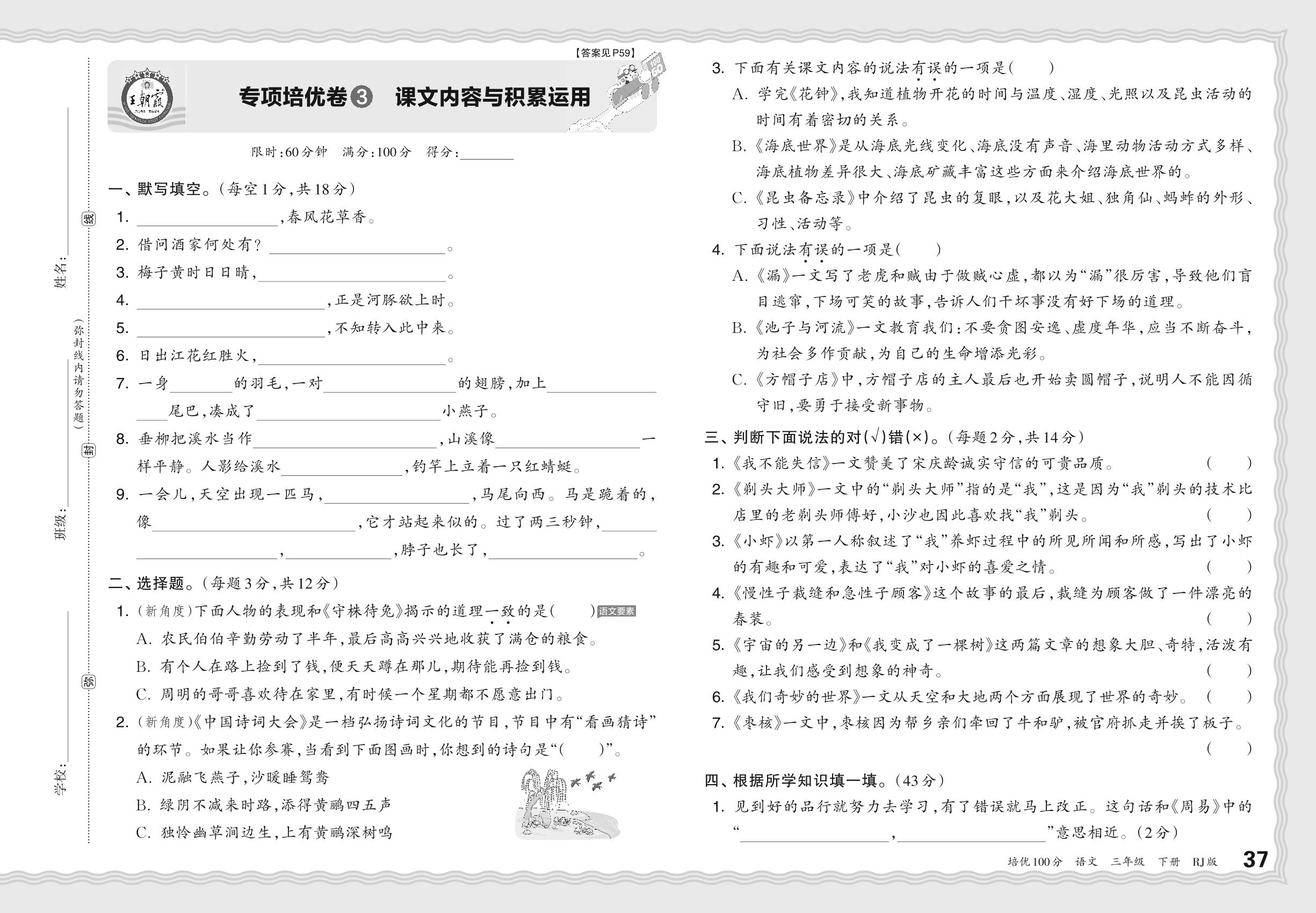 2024春下册三年级语文人教版 期末专项卷PY版·课文内容与积累运用【3】