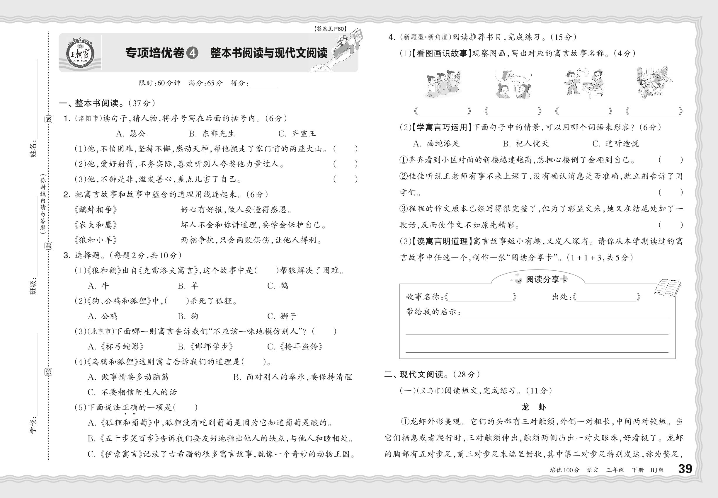 2024春下册三年级语文人教版 期末专项卷PY版·整本书阅读与现代文阅读【4】