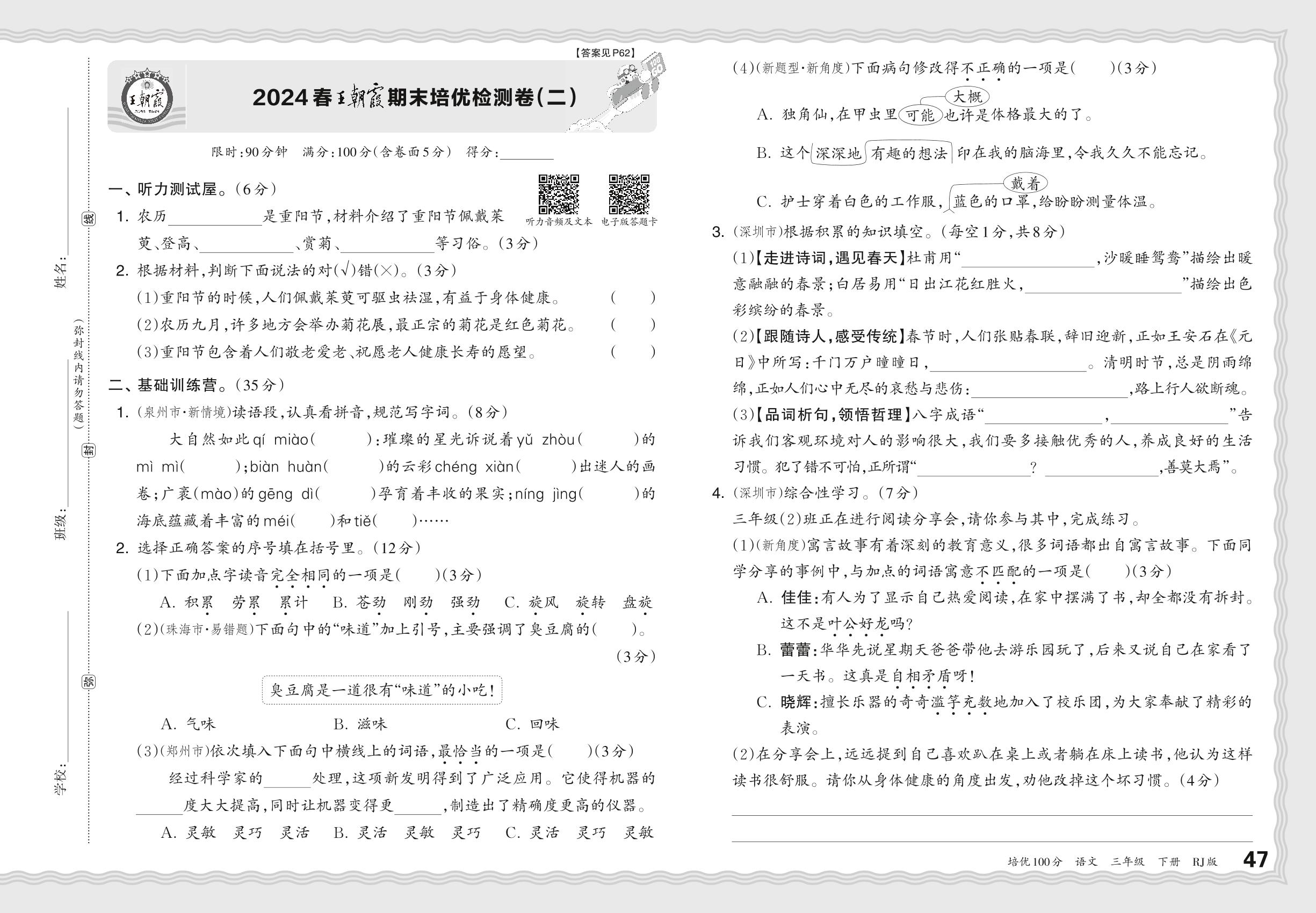 2024春下册三年级语文人教版 王朝霞期末培优检测卷(二)
