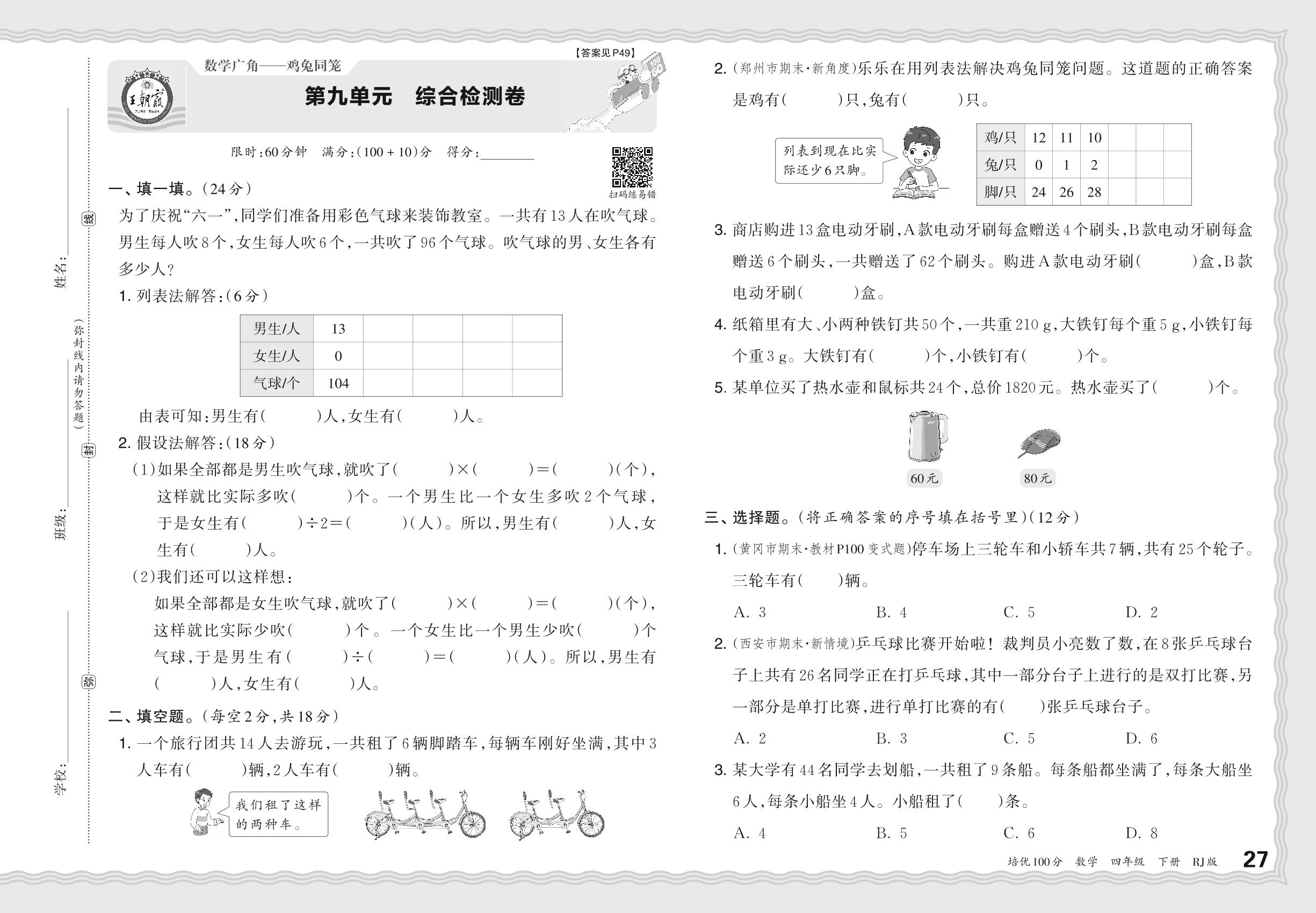 2024春下册四年级数学人教版 第九单元 综合检测卷