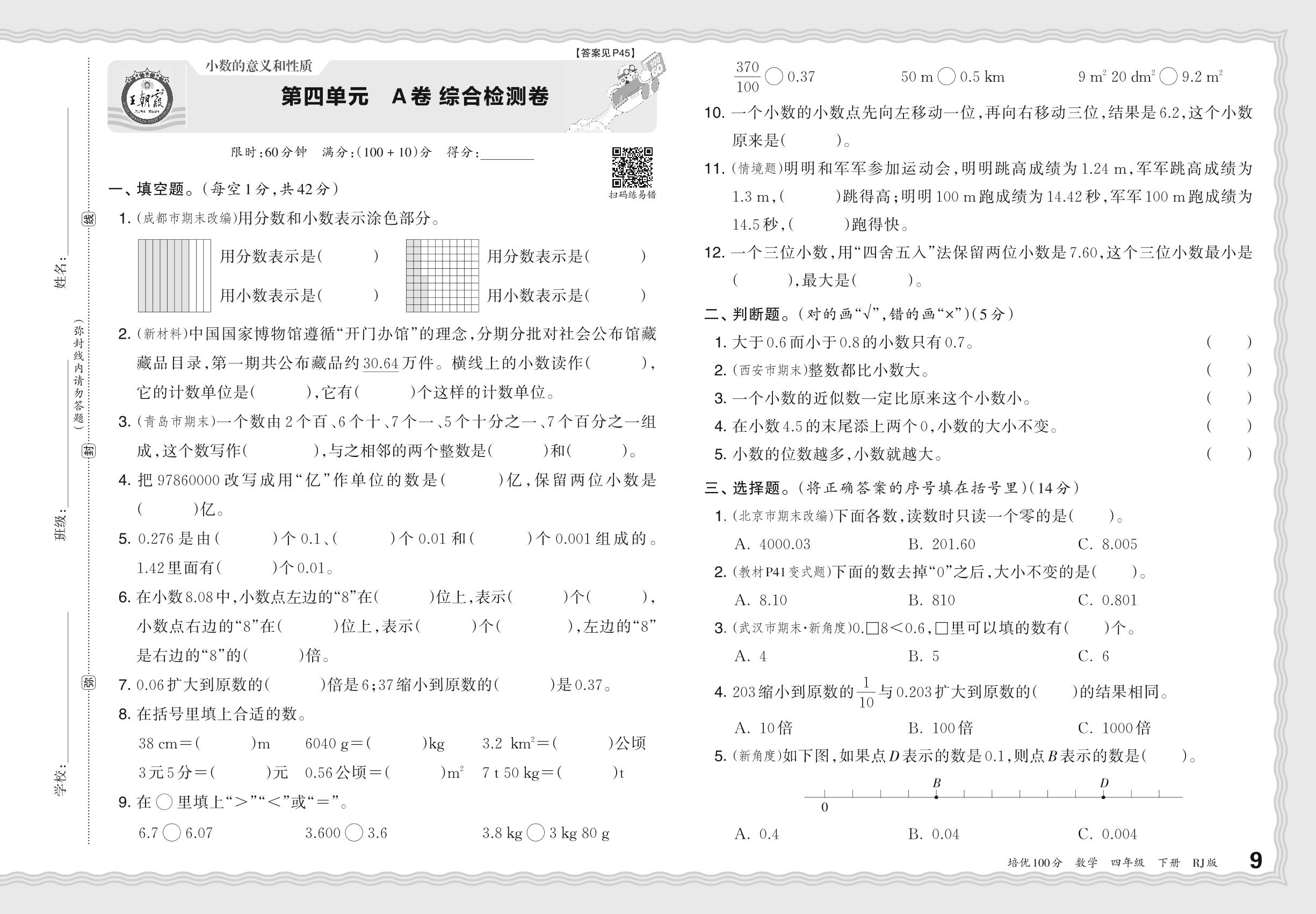 2024春下册四年级数学人教版 第四单元 A卷 综合检测卷