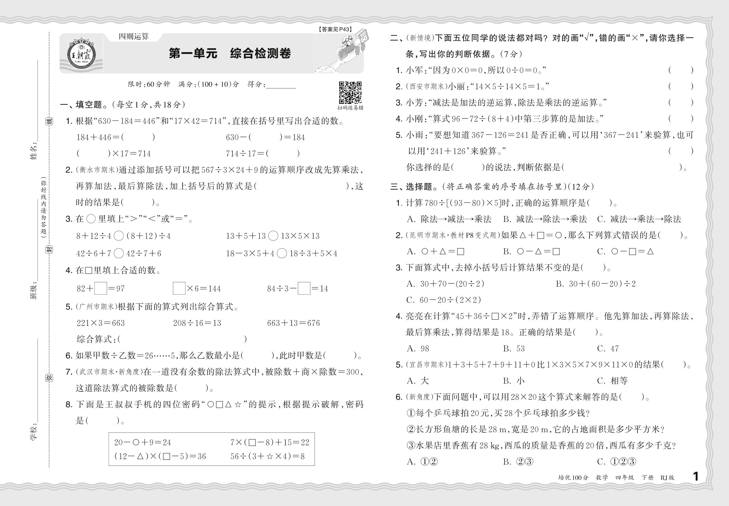 四年级数学人教版下册单元卷