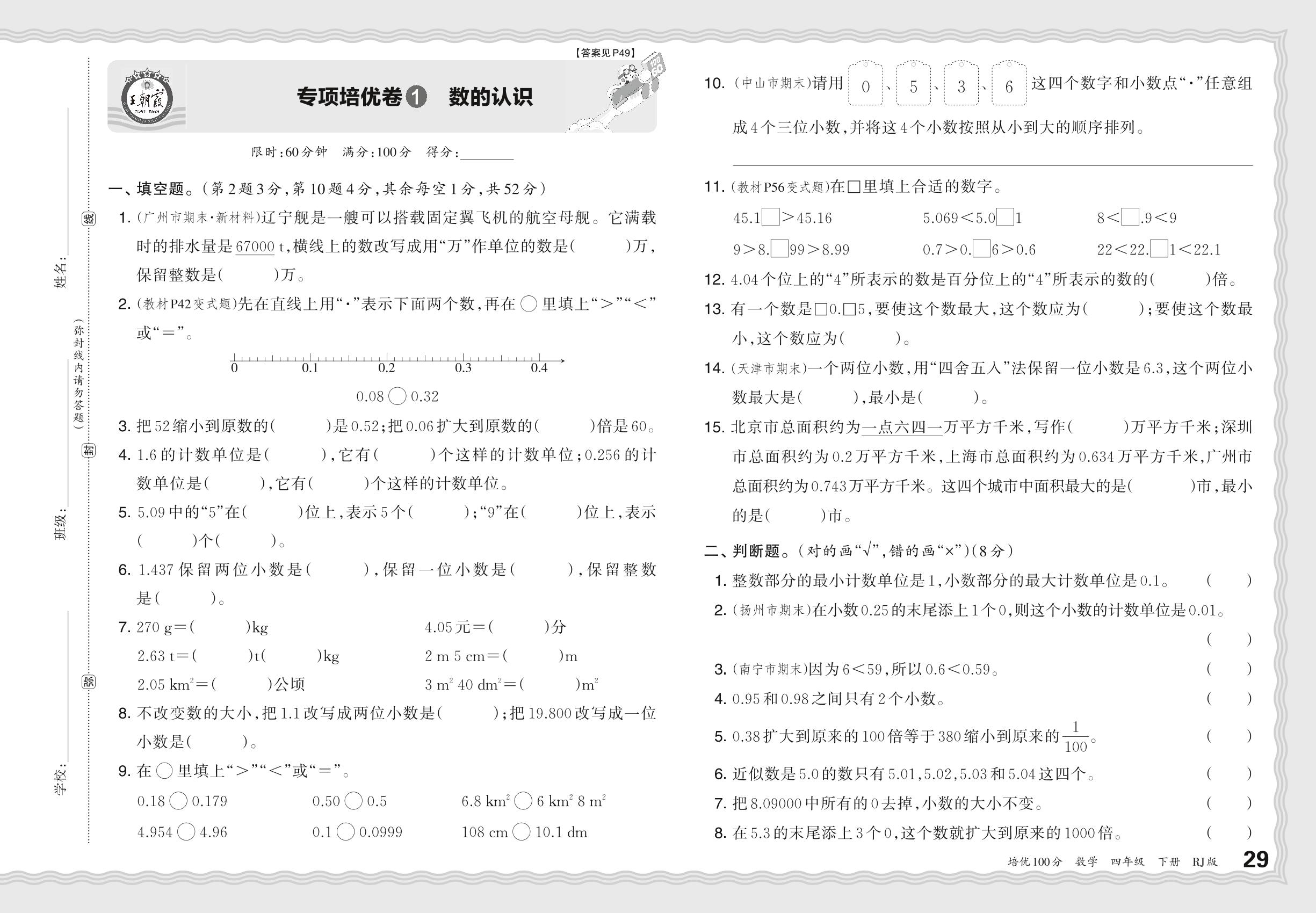 2024春下册四年级数学人教版 期末专项卷PY版·数的认识与常见的量【1】