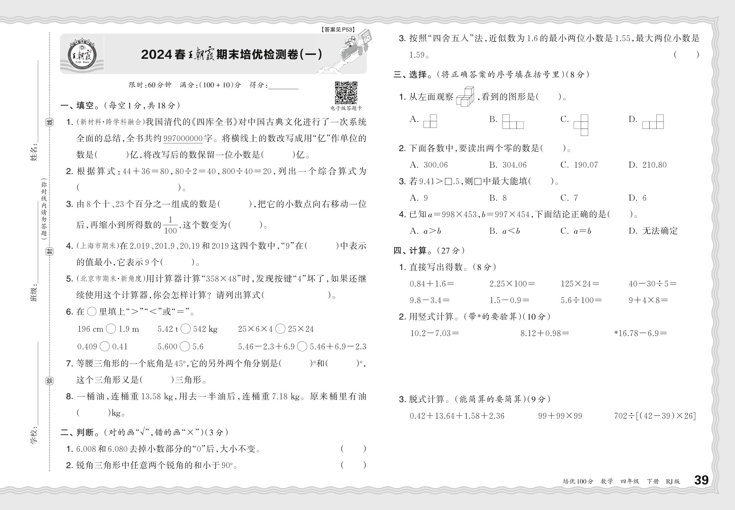 2024春下册四年级数学人教版 王朝霞期末培优检测卷(一)