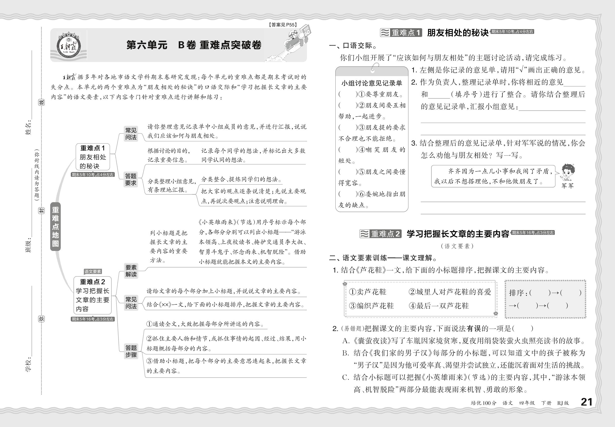 2024春下册四年级语文人教版 第六单元 B卷 重难点突破卷