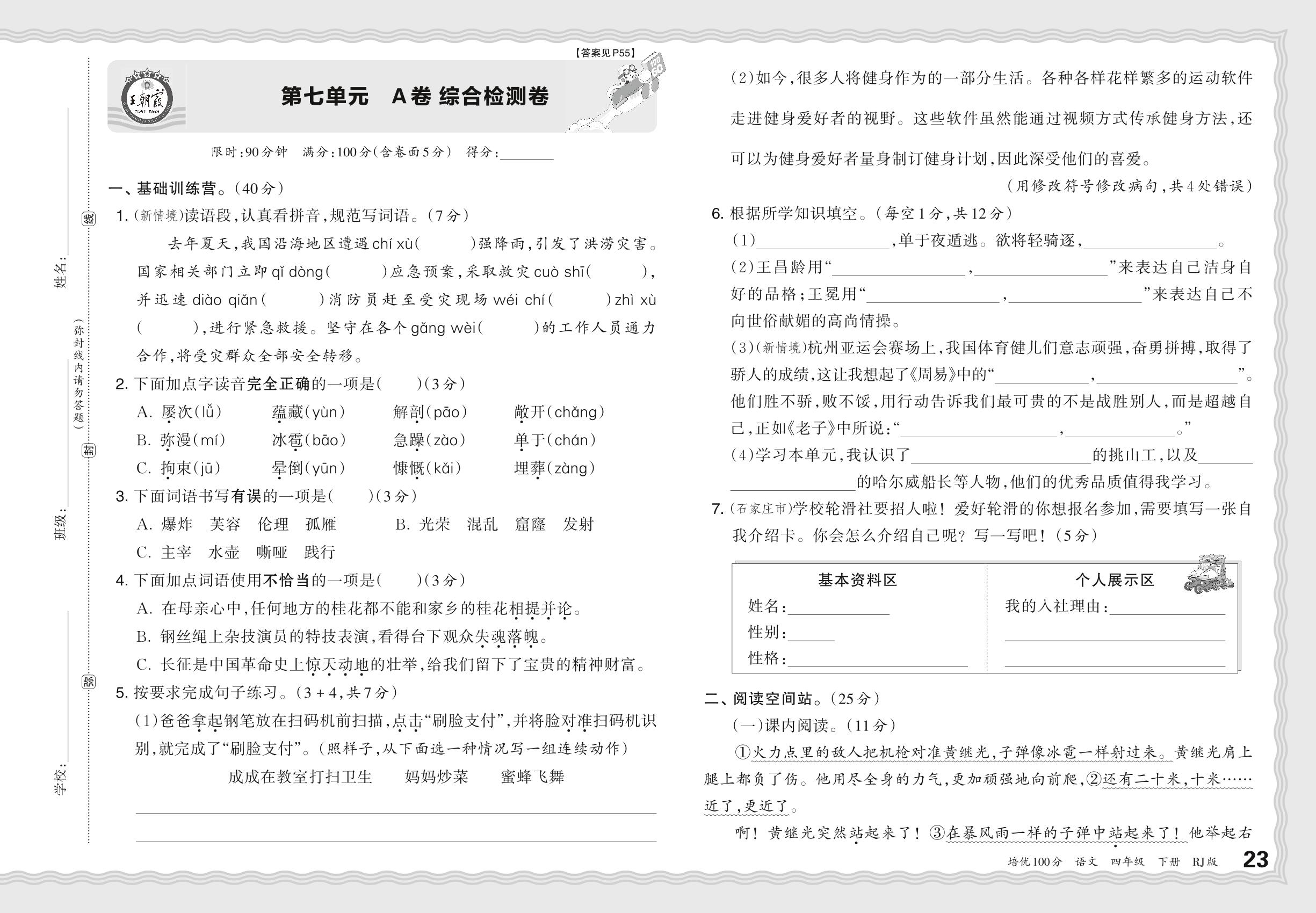 2024春下册四年级语文人教版 第七单元 A卷 综合检测卷